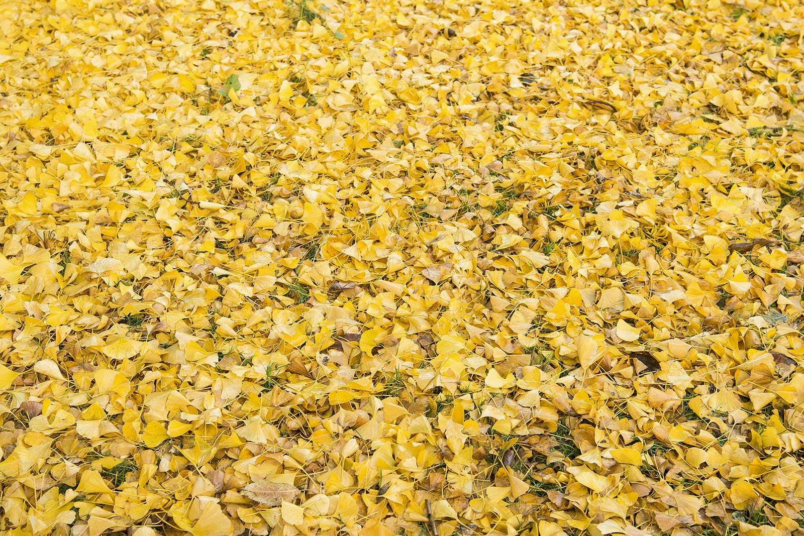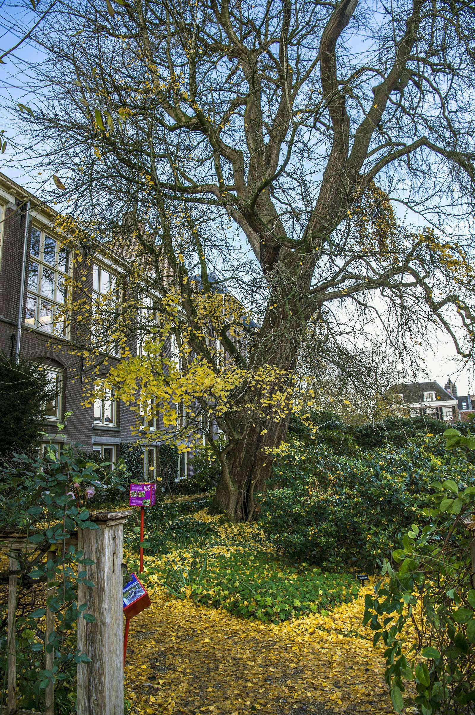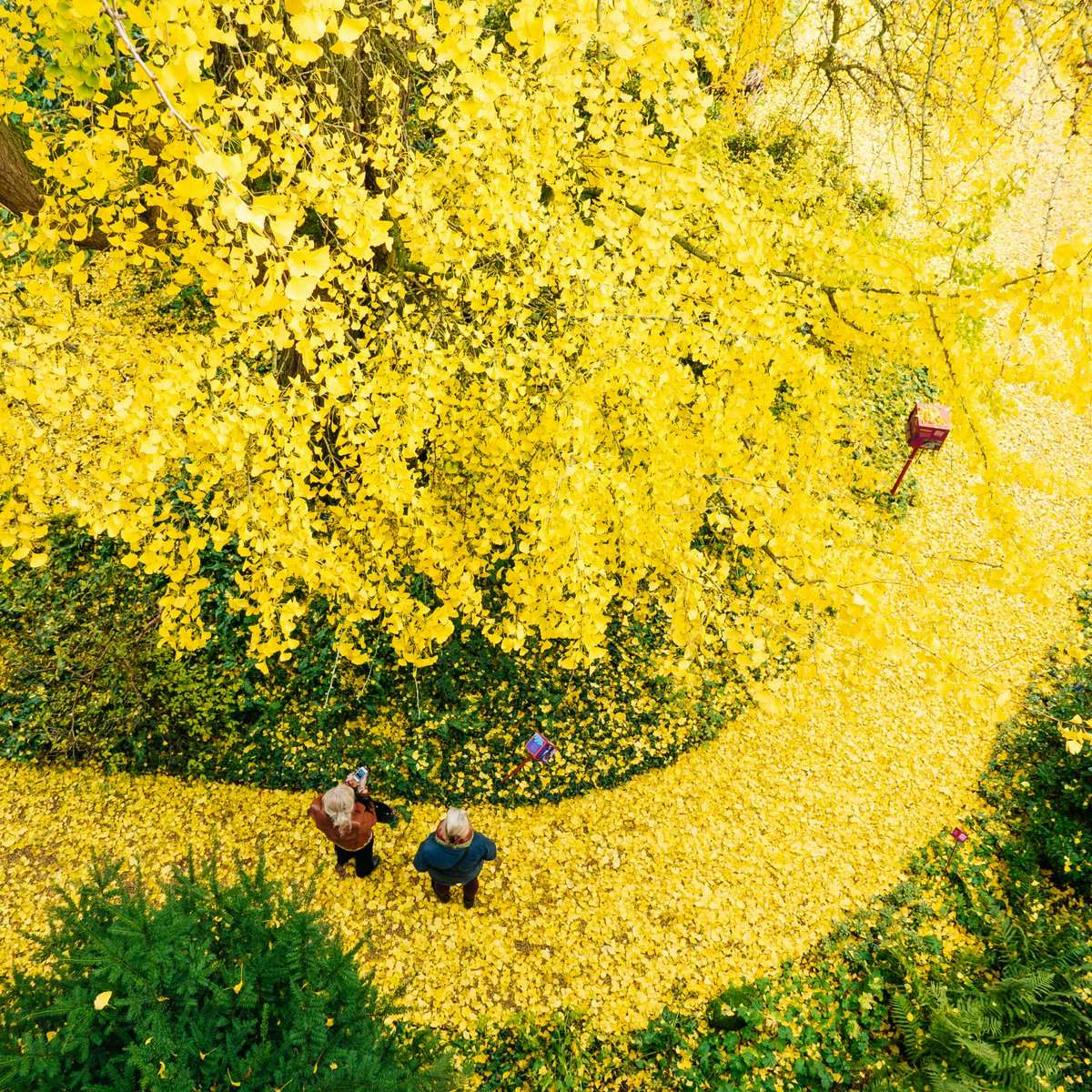 Een 260 jaar oude ginkgo zorgt voor prachtige herfstkleuren in de Oude Hortus in de binnenstad van Utrecht. De bladeren van de, van origine Japanse boom, zijn van groen naar geel gekleurd en kleuren ook de paden en het groen rondom de boom.