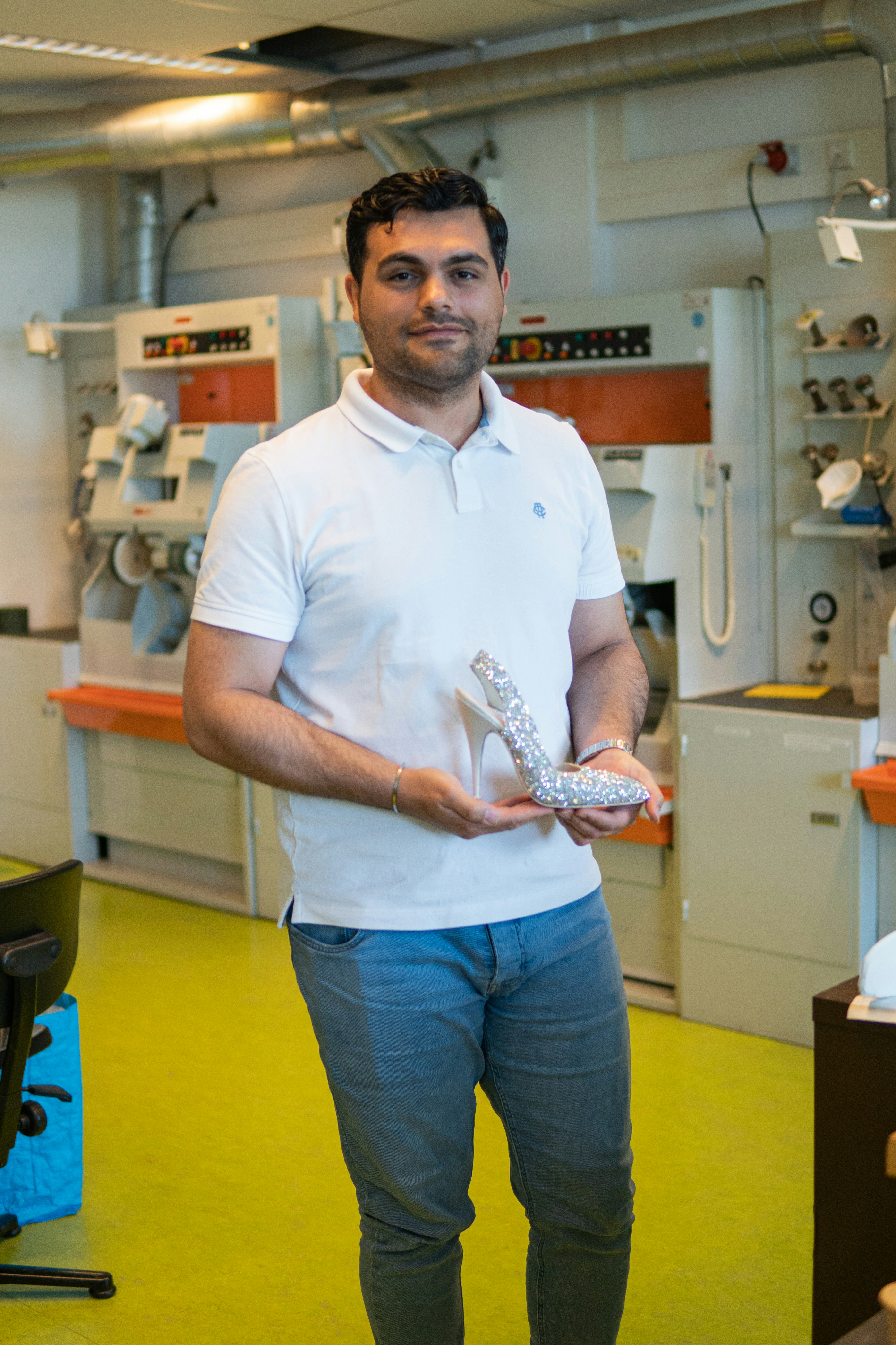 Drie paar fonkelende bruidsschoenen staan opgesteld, de chique witte schoenendozen met gouden belettering maken het helemaal af. “Ik heb schoenen voor mijn toekomstige vrouw ontworpen. Eigenlijk zouden we eerder al trouwen, maar vanwege corona moesten we dat uitstellen. De modellen zijn geïnspireerd op prinsessen en hebben alle drie een eigen naam. Mila, Sila en Gigi. Mijn toekomstige vrouw mag zelf kiezen welke ze wil dragen op de bruiloft.” De hoogte van de hakken – maar liefst 12 centimeter – zorgde voor een uitdaging bij het ontwikkelen van de glinsterende bruidshakken. Hoge hakken vragen om een sterke zool. Dat wist Apoo op te lossen met het sterke materiaal carbon dat onzichtbaar is verwerkt tussen de binnenzool en loopzool.