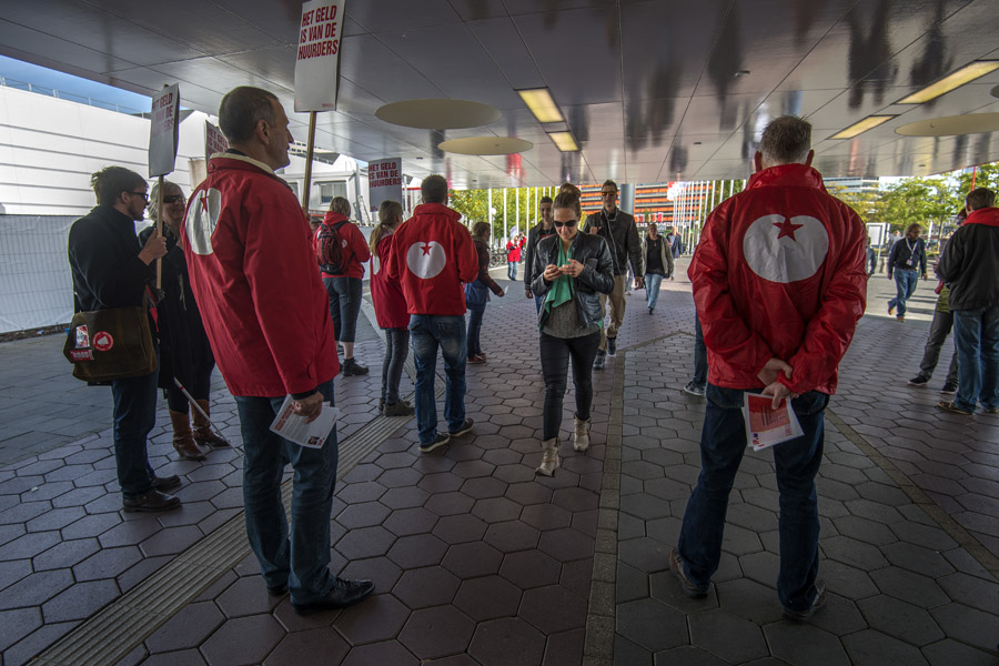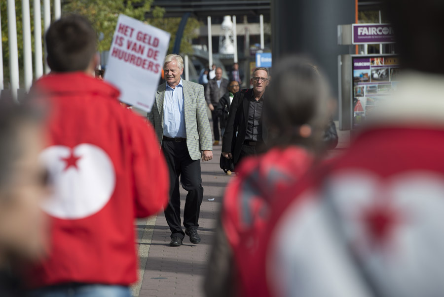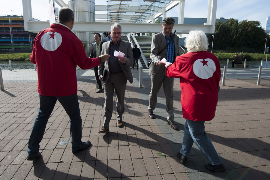 Tweede Kamerlid voor de SP Paulus Jansen en fractievoorzitter Tim Schipper van SP Utrecht deelden vanmiddag samen met anderen bij de ingang van de Jaarbeurs flyers uit en gingen in gesprek met mensen die naar het congres gingen. Jansen: “Ik denk dat we zo’n 100 directeuren gesproken hebben en ik hoop dat ze vanmiddag de juiste keuze maken en tegen dit akkoord stemmen.”