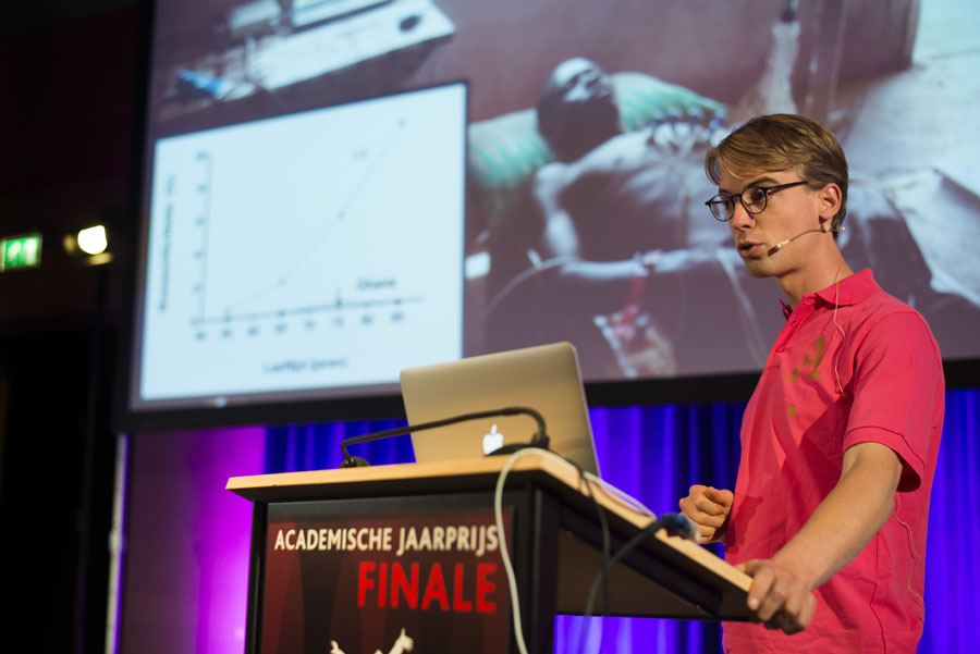 Als eerst is team “Oud of the box” aan de beurt. “Ons onderzoek is gestart op het platteland in Ghana. Daar keken we naar de veroudering van de mensen die leven in een omgeving van kleinschalige landbouw, een omgeving waar wij oorspronkelijk vandaan komen. Geen elektriciteit, lemen huisjes, veel handmatig werk”, zegt David van Bodegom.
