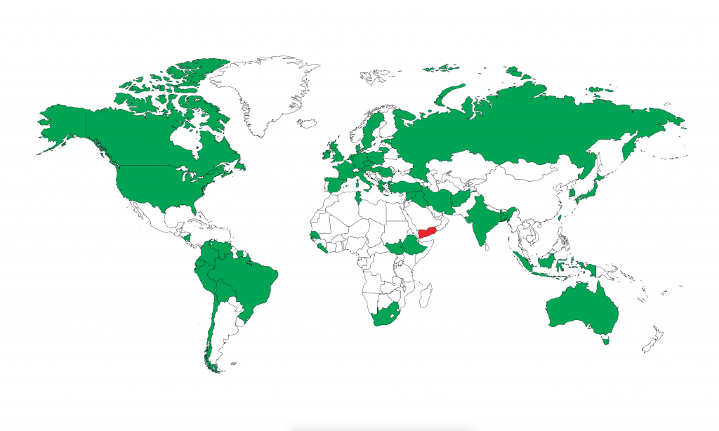 Afghanistan, Aruba, Australië, Bangladesh, België, Bolivia, Brazilië, Canada, Chili, Colombia, Curaçao, Denemarken, Duitsland, Ecuador, Engeland, Estland, Ethiopië, Finland, Frankrijk, Griekenland, Hongarije, Ierland, India, Indonesië, Irak, Iran, Italië, IJsland, Japan, Liberia, Litouwen, Macedonië, Marokko, Mexico, Nicaragua, Noord-Ierland, Oostenrijk, Peru, Polen, Portugal, Roemenië, Rusland, Senegal, Sierra-Leone, Spanje, Suriname, Syrië, Tadzjikistan, Taiwan, Thailand, Tsjechië, Tunesië, Turkije, Venezuela, Verenigde Staten, Zuid-Afrika, Zuid-Korea, Zuid-Soedan en Zwitserland.