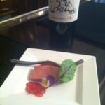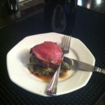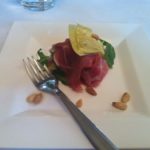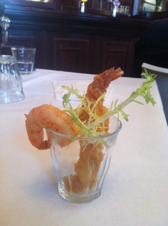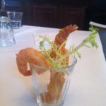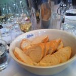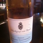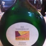 Als tweede wijn dronken we een witte wijn uit de Valle d’Aoste van de wijnboerderij Les Crêtes in Aymavilles, gemaakt van de Petite Arvine, een druif die laat rijp is, een verwijzing naar Bodard die op latere leeftijd ook pas zijn roeping zou vinden. Een elegante wijn, geen allemans vriend, fris met een hint van perendrups een klein bittertje in de afdronk. We aten hierbij een hapje van artisjokkenhart omwikkeld met ham uit Aosta. Als derde wijn, een Silvaner uit Escherndorfer Lump in de Franken. Silvaner niet zo’n geweldige druif maar in de Franken maakt Horst Sauer er een mooie wijn van met een lichte houtrijping.