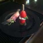 Mammoni, die de hapjes verzorgde serveerde hierbij een gamba in rode curry gemarineerd en een gefrituurde garnaal met wasibi, prima keuze. Als vierde wijn een Spätburgunder Weissherbst Trocken van Markgraf von Baden uit Ortenau, een goud-gele wijn met een subtiel zoetje. Daarna daagde Klaas de zaal uit:”Wie deze druif kent krijgt van mij een fles wijn” de Pelaverga Piccolo. Niemand durfde in de aanwezigheid van een priester te liegen, dus helaas de fles werd niet uitgedeeld. Deze zeldzame druif groeit alleen in Verduno, in Noord-West Italië, hier maken de Fratelli Allesandria er een lichte rode wijn van die fruitig en vol van smaak is met een pepertje in de afdronk. Bij deze gekoelde rode wijn aten we een Caprese en een rouleau van Mortadella. De volgende wijn was een volle rode wijn uit de Colli Berici (Veneto) van Carmenere Più en Merlot van Stefano Inama, deze zachte rode wijn met veel rood fruit, kruiden en peper werd gedronken bij een stukje Ardenner paté met gelei van rode bessen. Voor mij was de laatste wijn het topstuk: Els Pics, een rode wijn uit Priorat ten zuiden van Barcelona van Garnacha en Cariñena, op de steile en rotsachtige bodem groeien de druiven die alleen met de hand geplukt kunnen worden. Bodegas Mas Alta maakt er een prachtige complexe wijn van met een frisse geur, veel rijp roodfruit iets van chocolade. Een aanrader! te koop bij Henri Bloem voor 13,95. Er werd een stukje hertenbiefstuk op een stampotje van boerenkool bij geserveerd. ‘