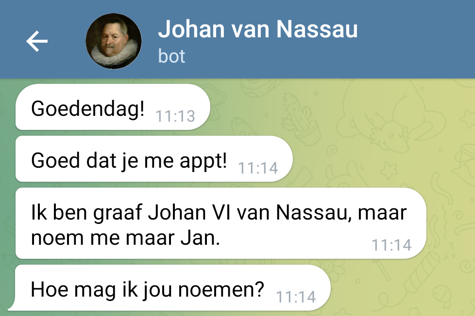 Als je op de app in deze chat nu eens zou invullen: “Geachte mijnheer Van Nassau, ik geef er de voorkeur aan u aan te spreken met mijnheer en stel het op prijs ook met mijnheer/mevrouw te worden aangesproken.” Wat zou er dan gebeuren? Slaat de app op tilt of zal de reactie zijn: “Sorry, ik begrijp niet wat je bedoelt”? Ik zou dat wel eens willen weten, maar heb geen smartphone met mogelijkheid tot app-en en het uit te proberen. Ouderwets hè, maar wel passend bij de hekel die ik heb aan al dat links en rechts maar tutoyeren door mensen die elkaar niet kennen. Voor mij is daarom ook de zestienjarige vakantiehulp bij de Hema een ‘zakelijk’ contact met een mij niet bekende en dus stel ik prijs op over en weer ‘U’. Dat geldt dus ook voor een eventueel onderhoud met mijnheer Jan van Nassau of de heer Clemens-Willibrord.