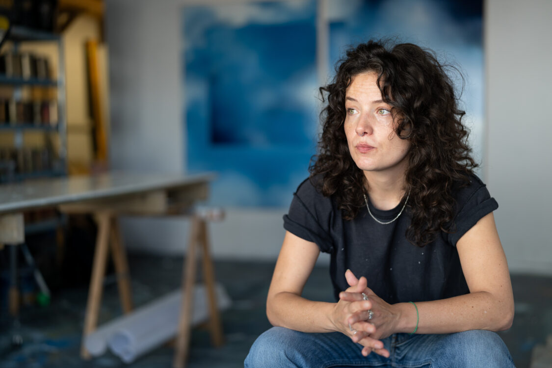 Als echte dagdromer kijkt ze veel omhoog, om zich heen en uit het raam. ”Daarom werk ik nu onder andere met wolken, mijn hoofd zit vol met herinneringen aan wolken.” Ze wijst naar het schilderij in haar atelier. “Ik kan niet zeggen welke herinneringen het zijn. Ik kan niet precies iets namaken, dan ben ik gelijk afgeleid.” En dus volgt ze haar intuïtie. “Het gaat bij mij uit het hoofd, en door wat mijn handen doen. Dus probeer ik allerlei verschillende beelden te vangen.”