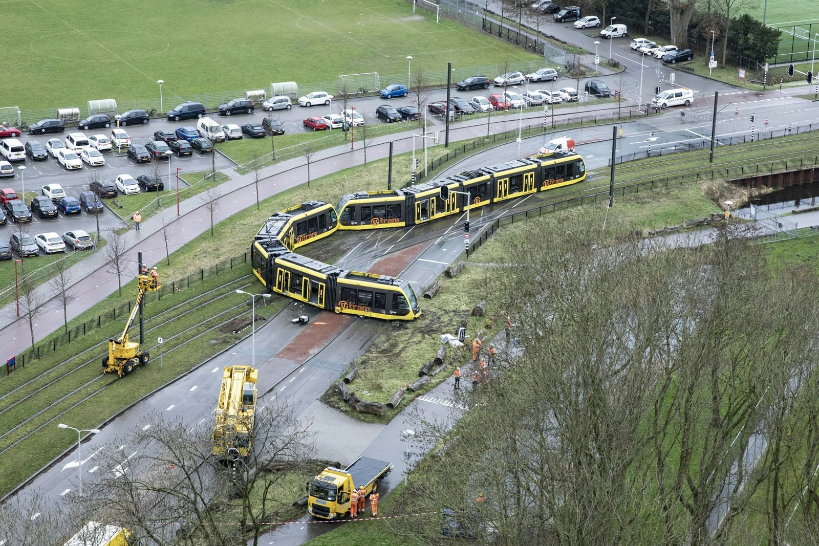 De berging van de tram die dinsdagochtend betrokken was bij een ongeluk op de Laan van Maarschalkerweerd in Utrecht is nog in volle gang. Het voertuig staat nog dwars over de weg en momenteel wordt het ontspoorde deel opgetakeld.