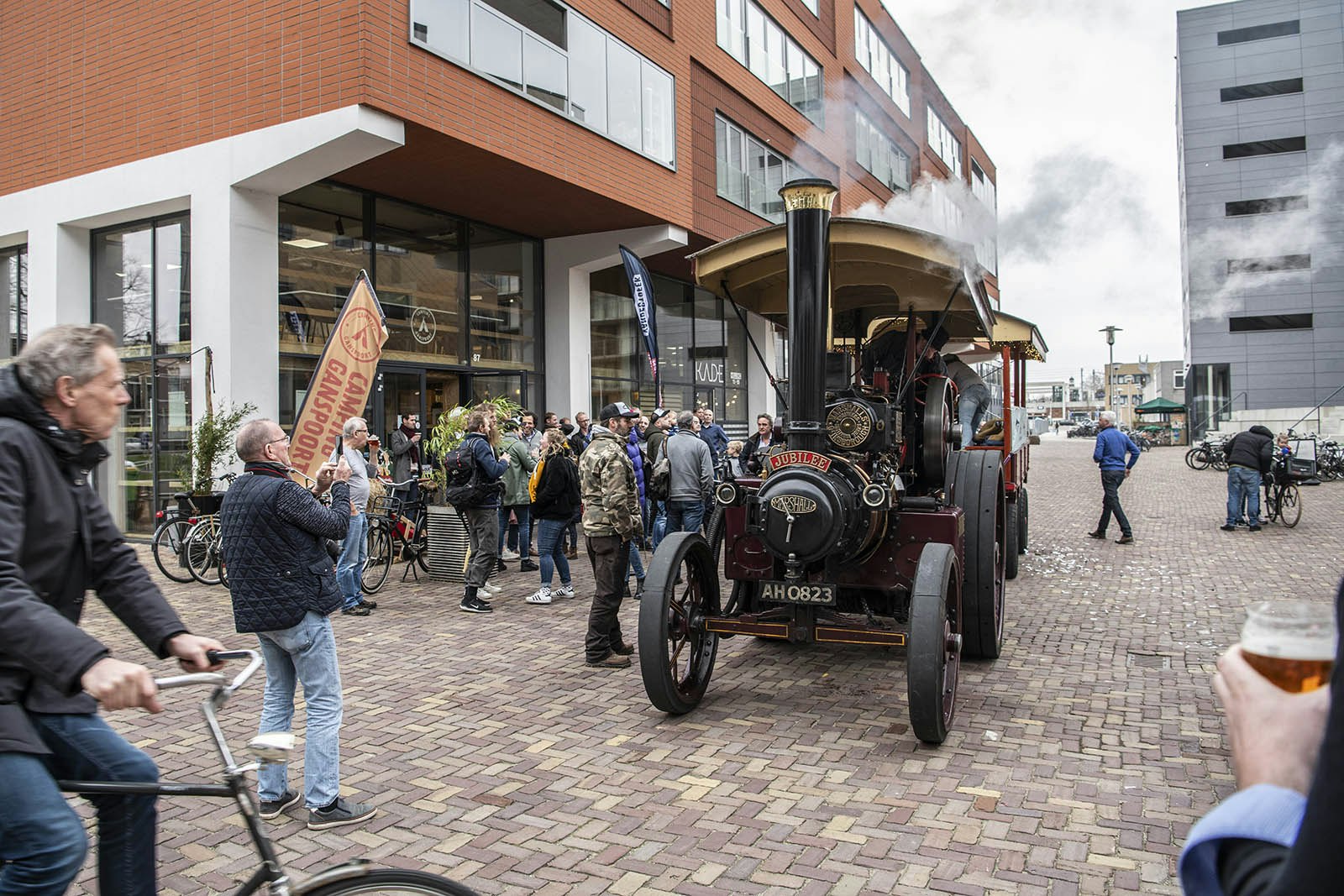 Sissend en fluitend reed de stoomtrekker door de stad. Het bijzondere voertuig trok een hoop bekijks naar zijn eindbestemming Camping Ganspoort waar het eerste fust bier Op Stoom werd geopend.