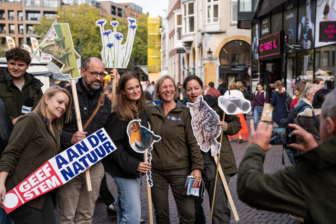 Op de overgang van het Vredenburgplein naar de Lange Elisabethstraat stond rond lunchtijd een donkergroen groepje. Het trekt aardig wat bekijks. “Boswachters komen niet zo vaak in de stad”, zegt een van hen. “In ieder geval niet in hun outfit.” In het midden van de groep staat een bak stokken met daaraan plaatjes van bomen, verrekijkers, vogels en de leus ‘geef stem aan de natuur’.