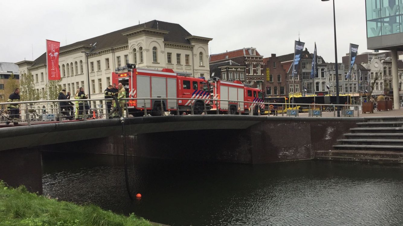 De brandweer heeft vanmiddag geoefend op de Vredenburgbrug. Met twee wagens pompte de brandweer met een grote slang water naar de wagen.