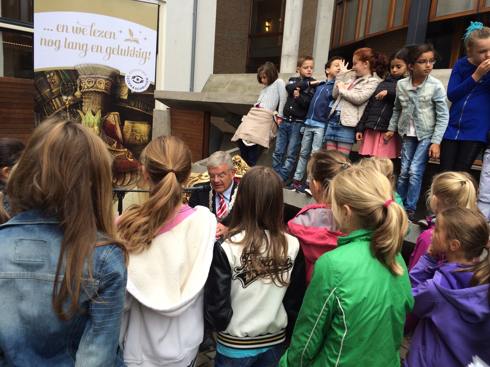 Burgemeester Jan van Zanen las vanochtend voor het Stadhuis sprookjes voor aan kinderen. Hij deed dit als aftrap voor de Week van de Alfabetisering.