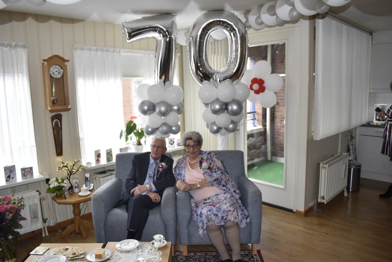 De woonkamer van Jan en Annie in hun woning in Rivierenwijk is zaterdagmiddag goed gevuld met familie, die druk in de weer is om het huiskamertje van het platina echtpaar voor te bereiden op de komst van de burgemeester. Er is taart en koffie en boven het hoofd van de twee jubilarissen prijken twee grote ballonnen die samen het getal 70 vormen.