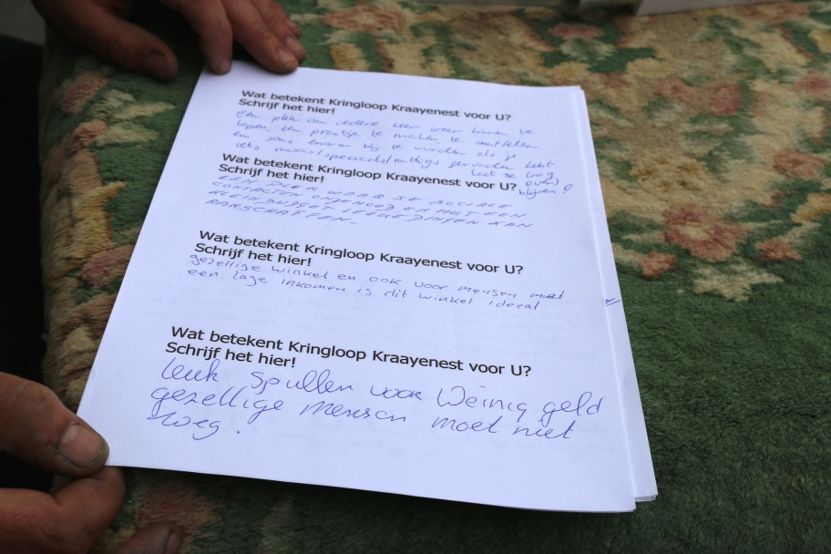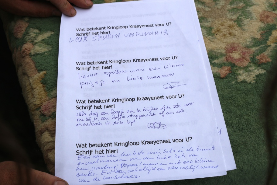 Vorige week zijn de medewerkers van Kraayenest een petitie gestart, waar nu al ruim 350 handtekeningen op staan. Ook hebben ze aan alle klanten gevraagd op te schrijven wat ze zo bijzonder vinden aan de winkel. Uit deze papieren komt naar voren dat voor veel mensen Kraayenest veel meer is dan gewoon een kringloopwinkel: “We hebben ontzettend veel vaste klanten die elke dag even naar binnen lopen, een kledingstuk voor een euro kopen en weer weg gaan. Ze willen voornamelijk even een praatje maken,” vertelt Breedijk trots. “Als we moeten verhuizen, verliezen we dit allemaal. Dan moeten we ons hele klantenbestand opnieuw opbouwen en verliezen de mensen in de buurt hun ontmoetingsplek.”