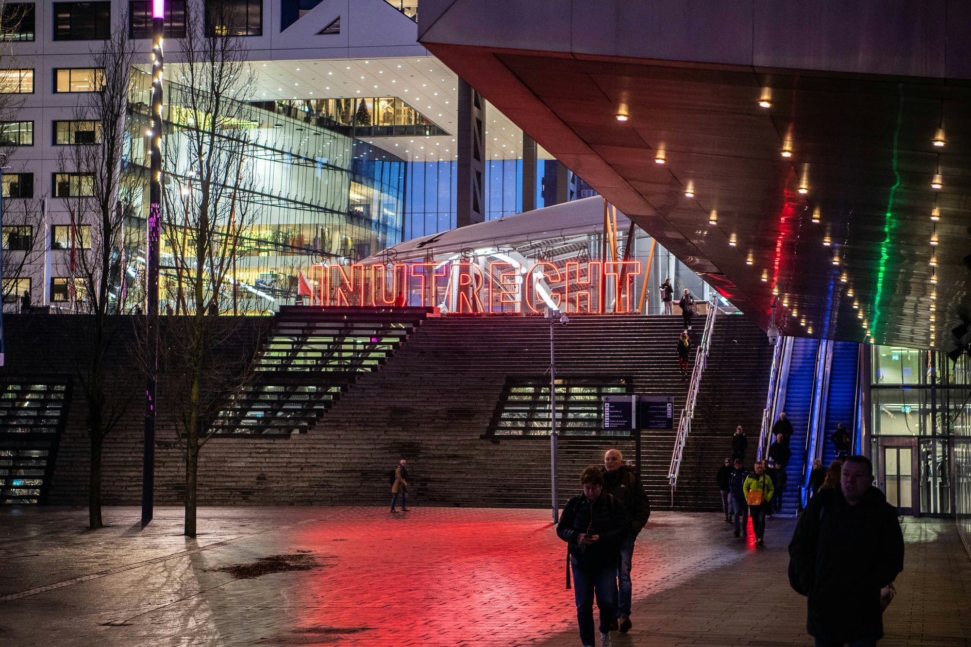 In grote letters is ‘Christmas in Utrecht’ te lezen op het Stadsplateau in Utrecht. De letters boven de trappen op het Jaarbeursplein zijn deze week geplaatst en moeten vol komen te hangen met kerstwensen.