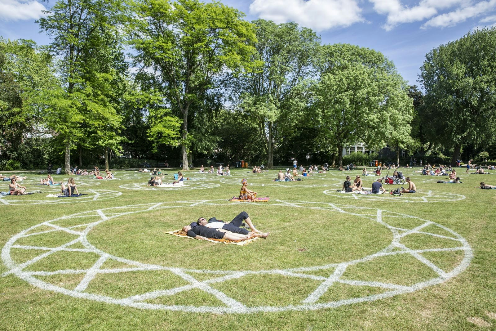 Op een deel van het grote grasveld van het Julianapark in Utrecht zijn afgelopen week cirkels aangebracht. Deze cirkels moeten ervoor zorgen dat bezoekers afstand van elkaar houden.