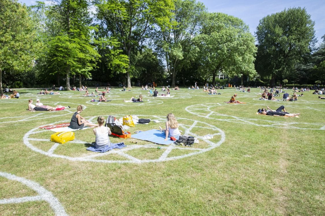 Op een deel van het grote grasveld van het Julianapark in Utrecht zijn afgelopen week cirkels aangebracht. Deze cirkels moeten ervoor zorgen dat bezoekers afstand van elkaar houden.