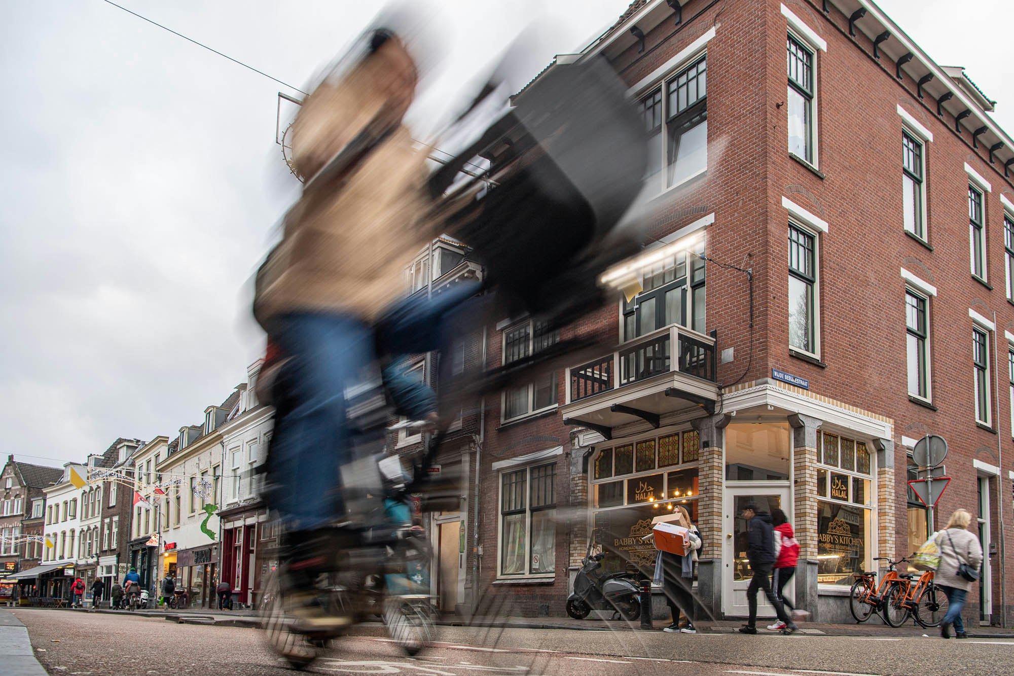 Bewoner Johan van Veen (62) heeft uitzicht op de Neude en weet alles van de drukte van het fietspad. Tussen zijn voordeur en de voorbijrazende fietsers is slechts een meter stoep. “Ik zit nog niet op mijn fiets of ik sta al in het drukke verkeer. Soms moet ik een tijdje wachten totdat ik makkelijk in kan voegen. Dat er na de herinrichting meer plek voor fietsers zoals ik is, is heel fijn.” Hij zet zijn bril nog even recht en duikt met een snelle beweging tussen twee fietsers.