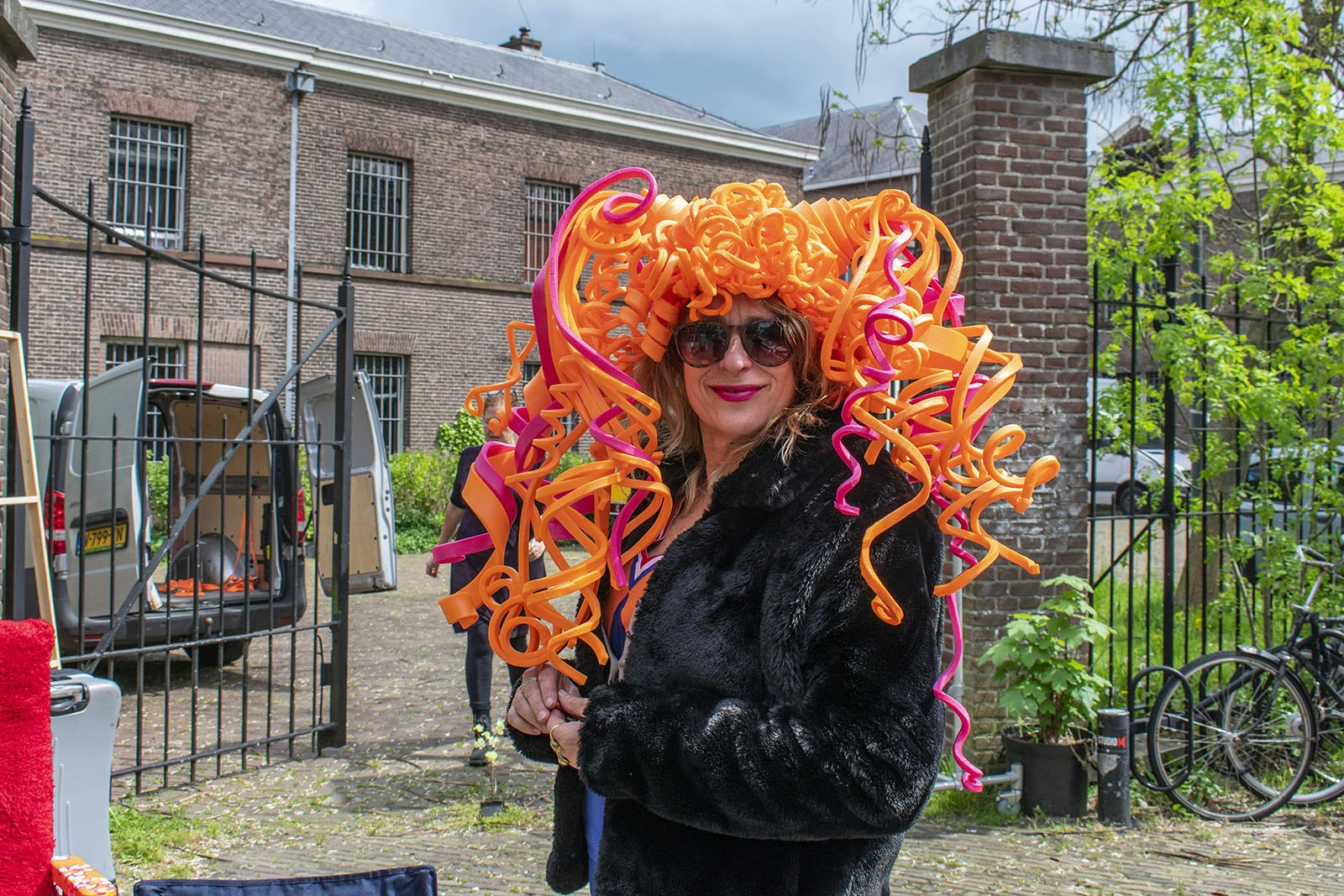 Selma en Yvonne verkopen alleen maar ludieke oranje spulletjes. “Ik ben het hele jaar door bezig geweest om strikjes voor andere mensen te maken”, vertelt Selma. “En we hebben allebei een oranje pruik gemaakt van foam. Vanavond ondergaan we een metamorfose en dan wordt het allemaal een blije toestand.” Yvonne komt met een gigantische hoed tevoorschijn. “Mijn haar zit nu niet zo goed hoor. Maar vanavond zal het er fantastisch uitzien.”