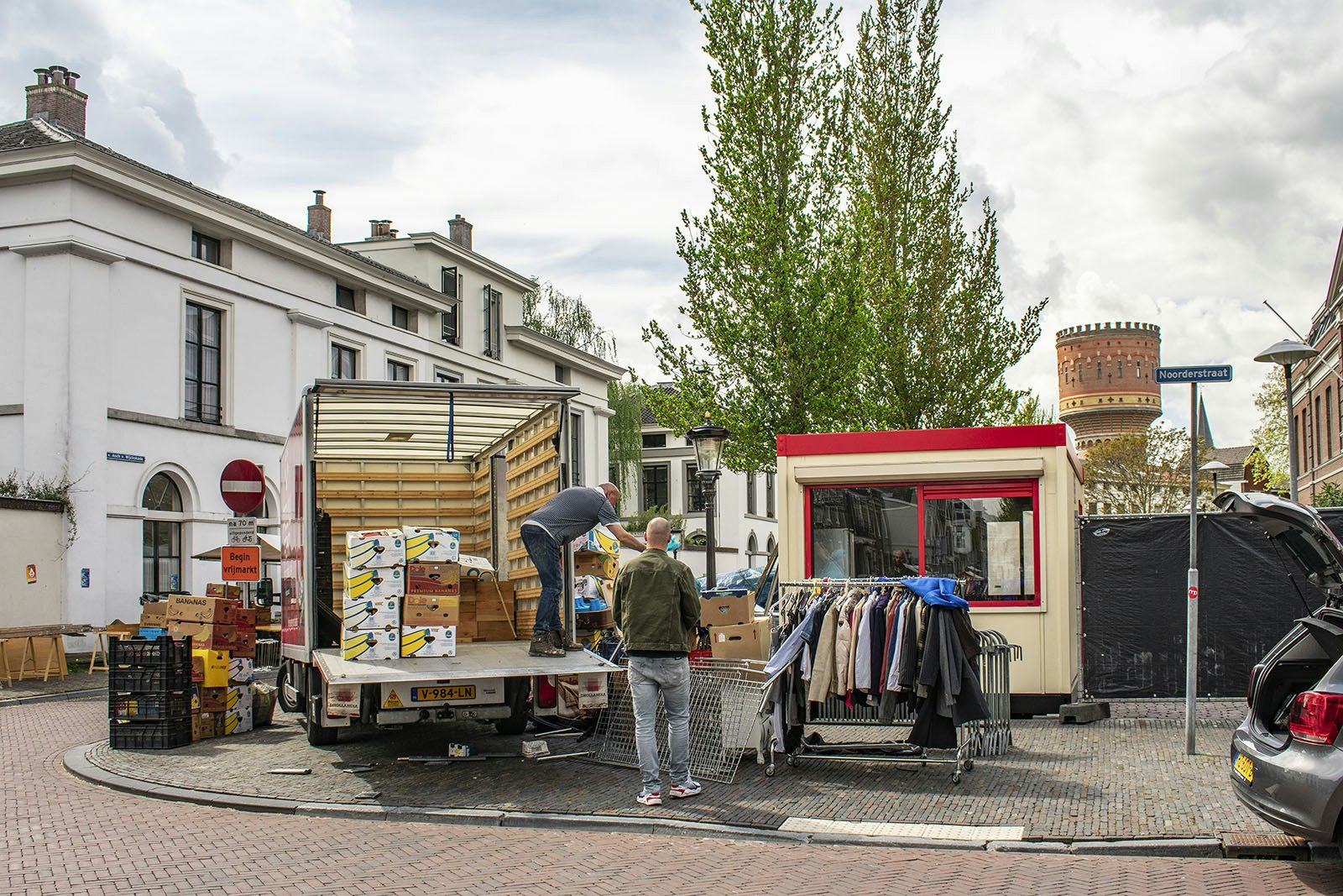 “Het is heel moeilijk om een plekje te vinden. Alle bewoners hebben stickers op hun ramen”, zegt Joke geïrriteerd. “We hadden eerst al onze spullen op een ander plekje uitgepakt, maar toen kwamen de bewoners van dat huis naar buiten. Ze hadden wel een affiche op hun raam gehangen, maar die was eraf gewaaid. Gelukkig zei de buurman toen dat we wel op zijn plek mochten staan.” Al is de kraam van Joke niet de meest makkelijke kraam om een plek voor te vinden. Hij bestaat uit drie delen en beslaat meerdere meters.