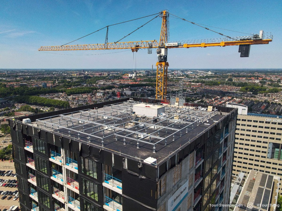 Er is gestart met de afwerking van de buitenzijde van de Galaxy Tower aan het Jaarbeursplein in Utrecht. Zo worden de gevelstenen geplaatst en op het dak komen de frames voor zonnepanelen.