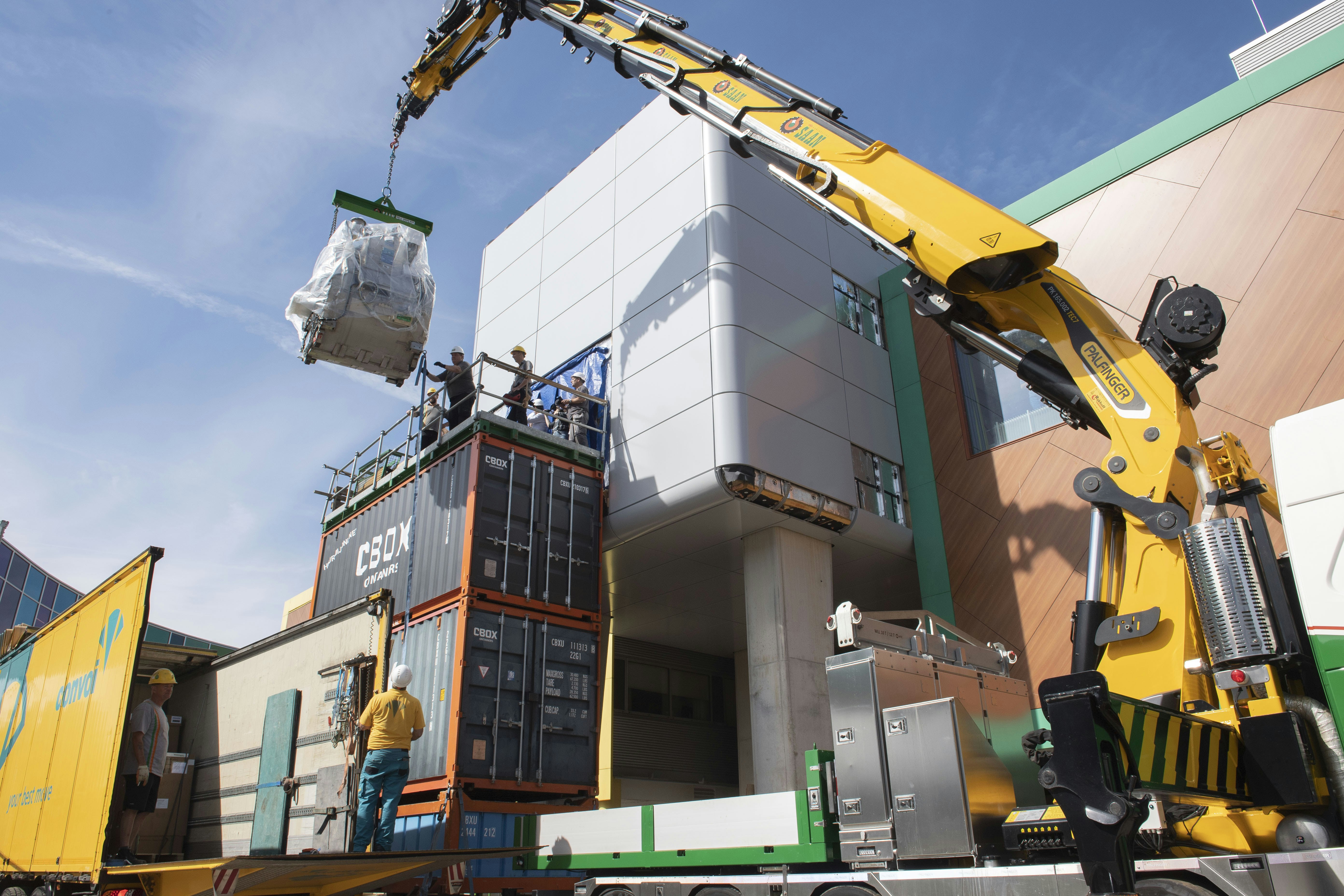 Een 6.300 kilo zware magneet is dinsdagochtend met een grote kraan opgetakeld en door een gat geschoven in de gevel van de nieuwe operatiekamer van het Wilhelmina Kinderziekenhuis (WKZ).