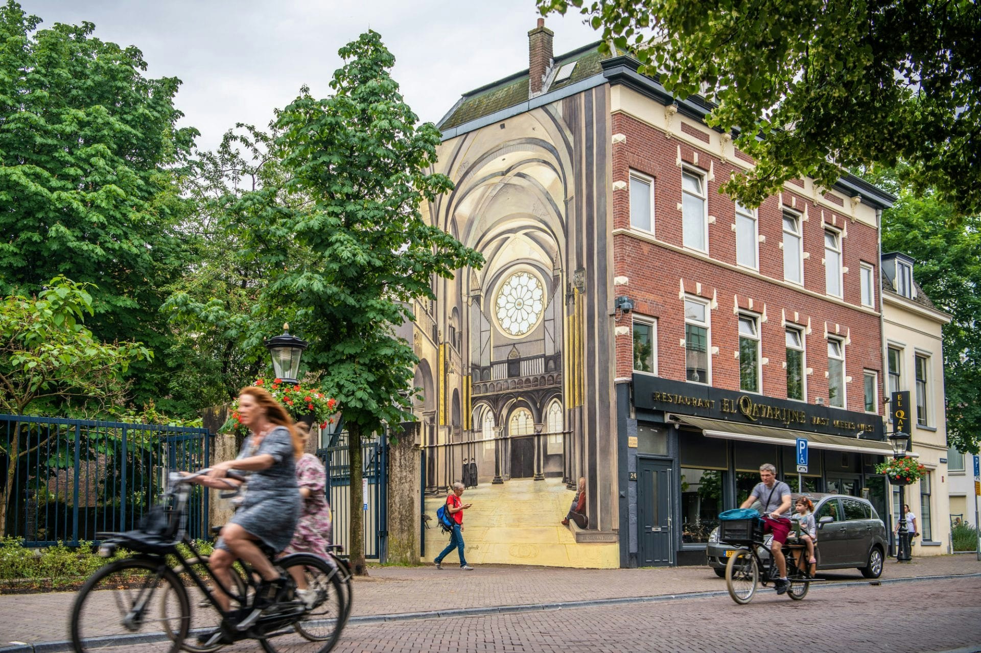 De Strakke Hand heeft afgelopen week een nieuwe muurschildering onthuld. Het werk brengt de Mariakerk terug in het straatbeeld en is onderdeel van een grote opknapbeurt van het Maria Majorplein.