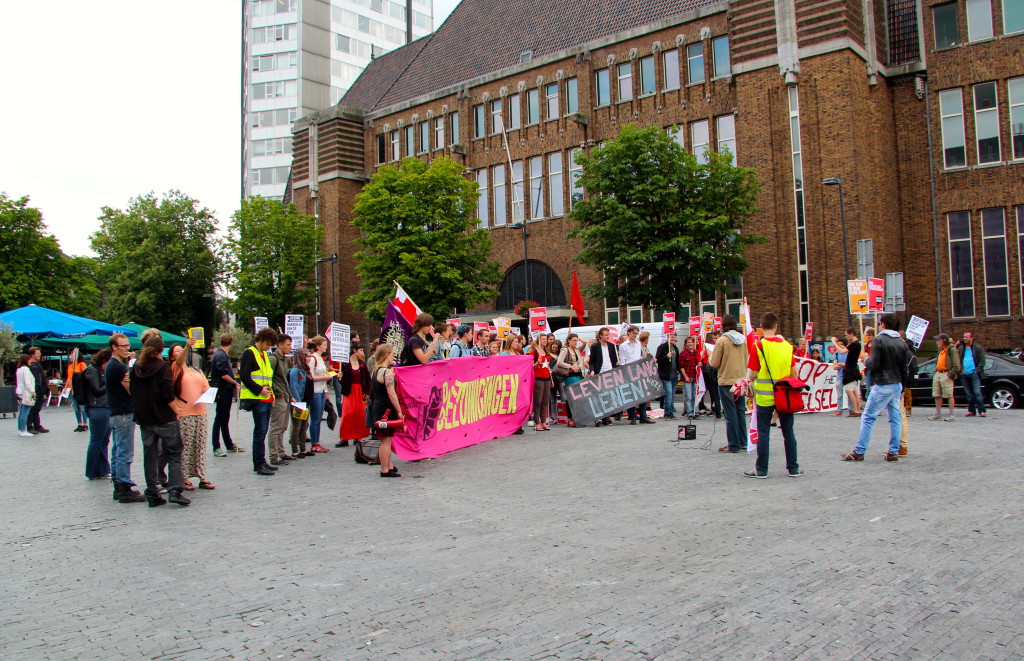 De demonstranten zijn inmiddels aangekomen op het Domplein. Voor het Verzetsmonument houdt de groep stil. Een meisje van ROOD houdt een korte toespraak en bedankt iedereen voor zijn deelname aan de demonstratie vandaag.