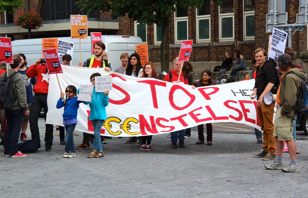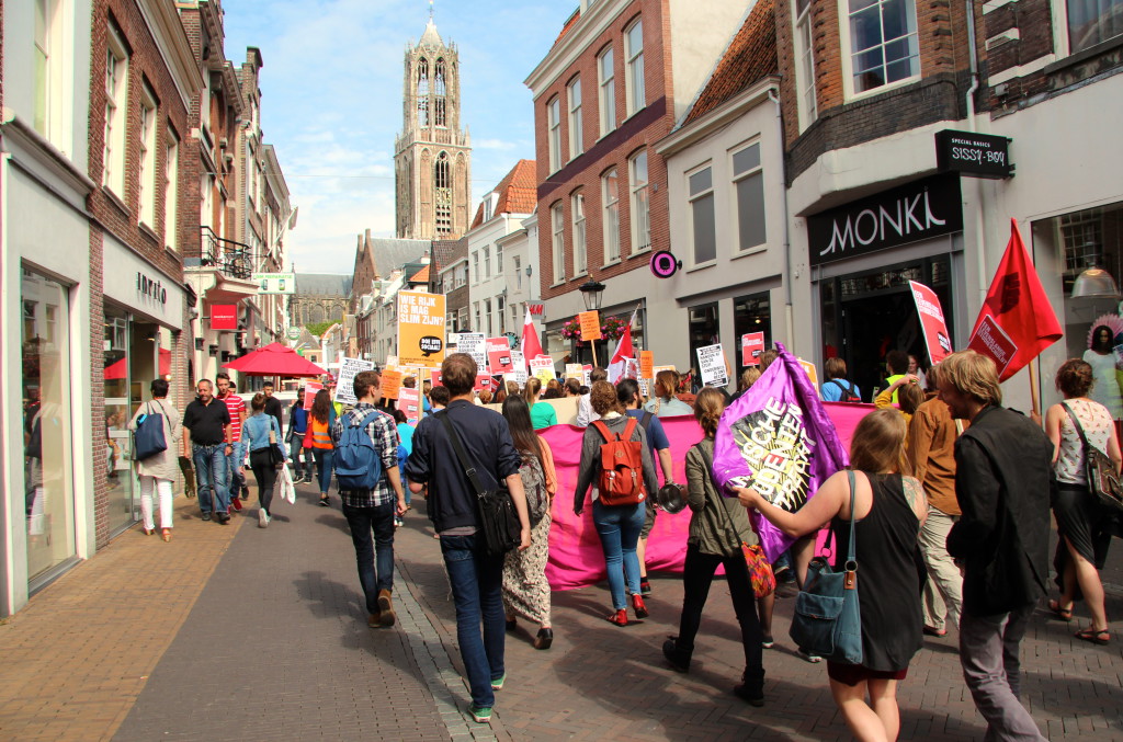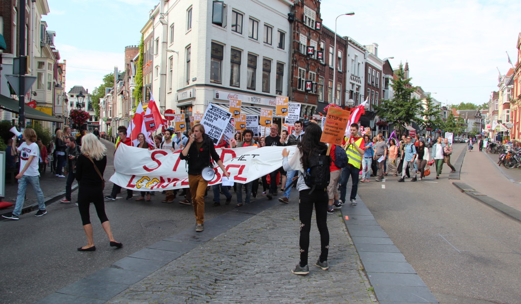 Het is vier uur in de middag. Zo’n honderdvijftig mensen hebben zich verzameld op de Neude voor een demonstratie tegen de invoering het ‘schuldenstelsel’, zoals zij het leenstelstel noemen. Het is een gemêleerd gezelschap: studenten van het ‘open collectief’ Kritische Studenten, mensen van de studentenvakbond en leden van ROOD, de jongerenorganisatie van de SP.