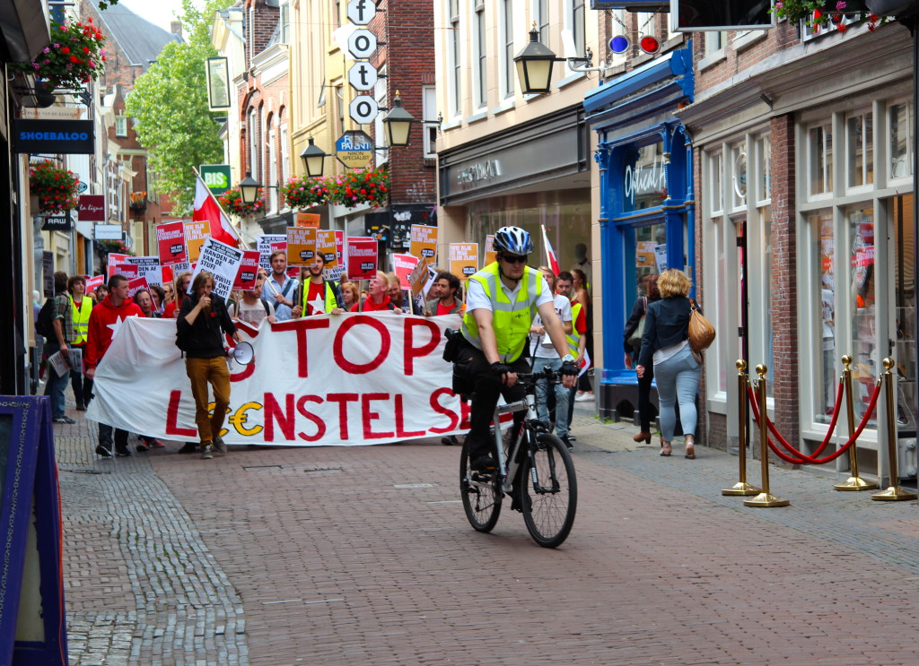 Onder begeleiding van enkele agenten op de fiets beginnen de demonstranten met een wandeltocht door de Utrechtse binnenstad. Jansen vertelt dat dit de tweede demonstratie is tegen het ‘schuldenstelsel’ dat het kabinet wil gaan invoeren.