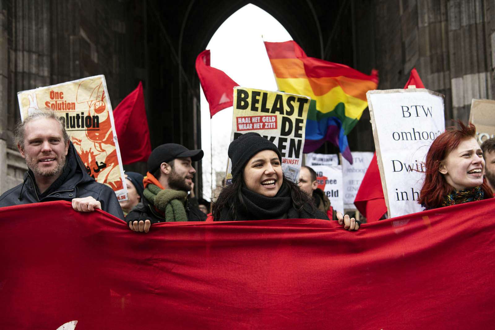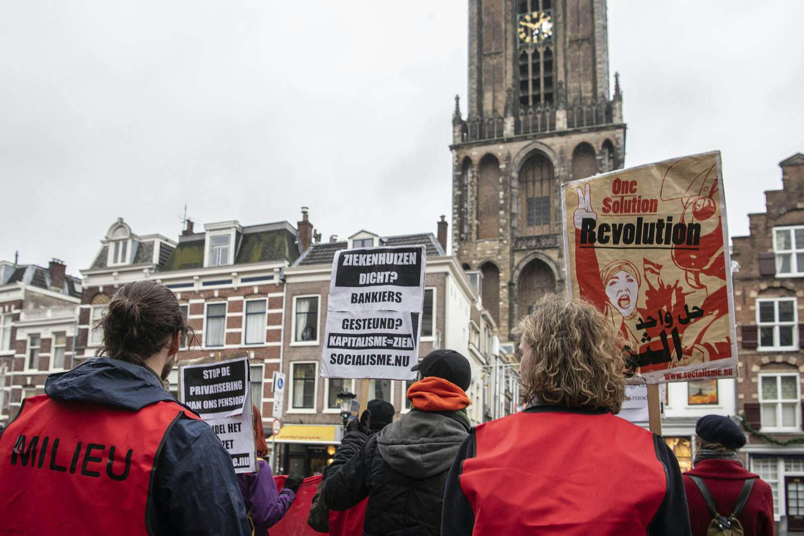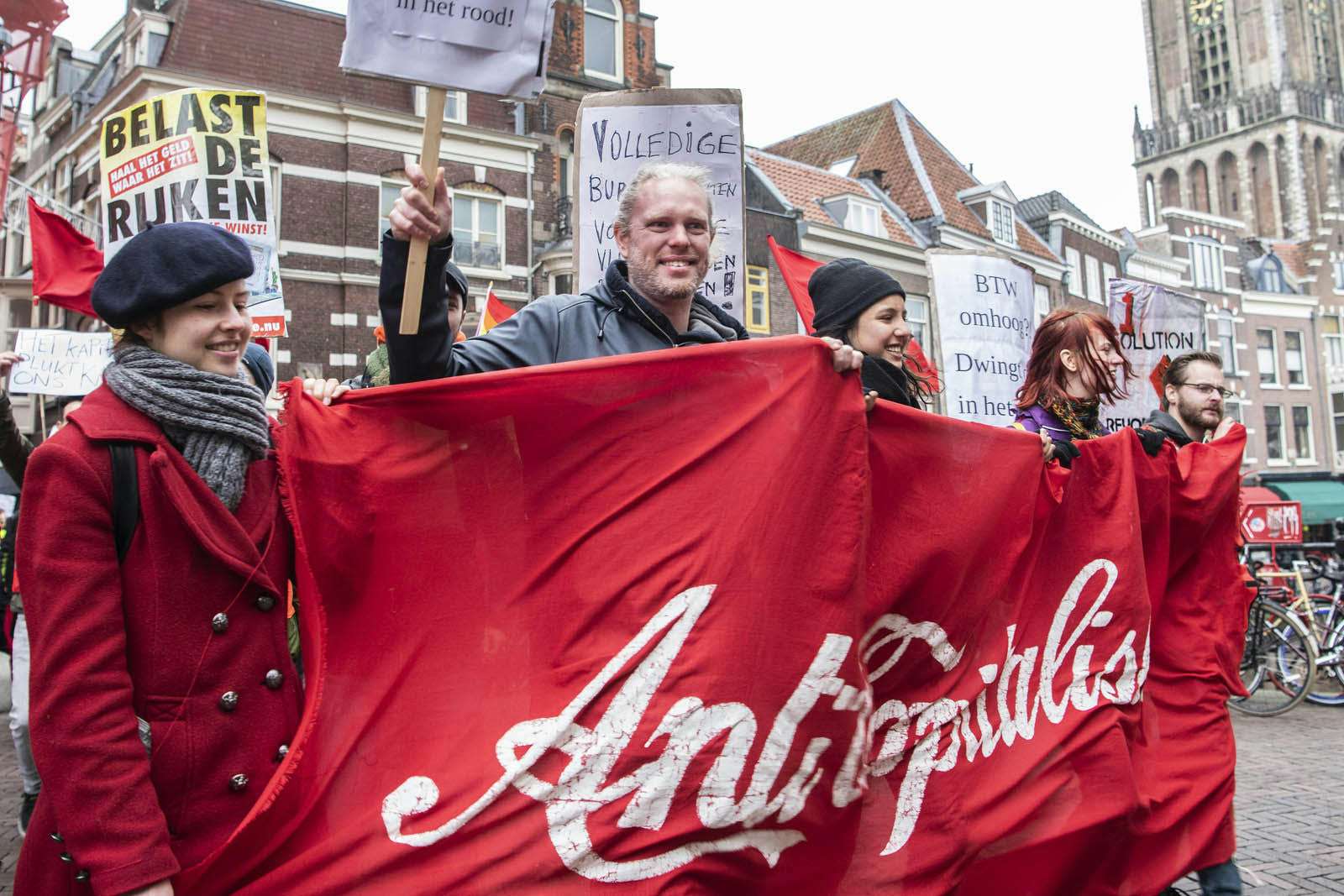 Na het welkomstwoord, en een cover van ‘Gemeengoed’ van protestzanger Armand door mede-organisator Patrick Bakkenes, begint de stoet met veel gejoel aan een tocht door de smalle straatjes van de Utrechtse binnenstad. Voorafgegaan door een groepje met een groot rood ‘Anti-Capitalista’ spandoek en bewapend met borden met daarop teksten als ‘One solution: Revolution’ en ‘Het kapitaal plukt ons kaal!’ baant de menigte zich een weg naar het Domplein. Onderweg trekt de protestmars veel bekijks, mede door één demonstrant met megafoon die zijn mede-demonstranten aanspoort tot het zingen van protestleuzen. “Bezet, blokkeer, dit beleid pik ik niet meer!”, klinkt het in koor. “Het is genoeg geweest!”
