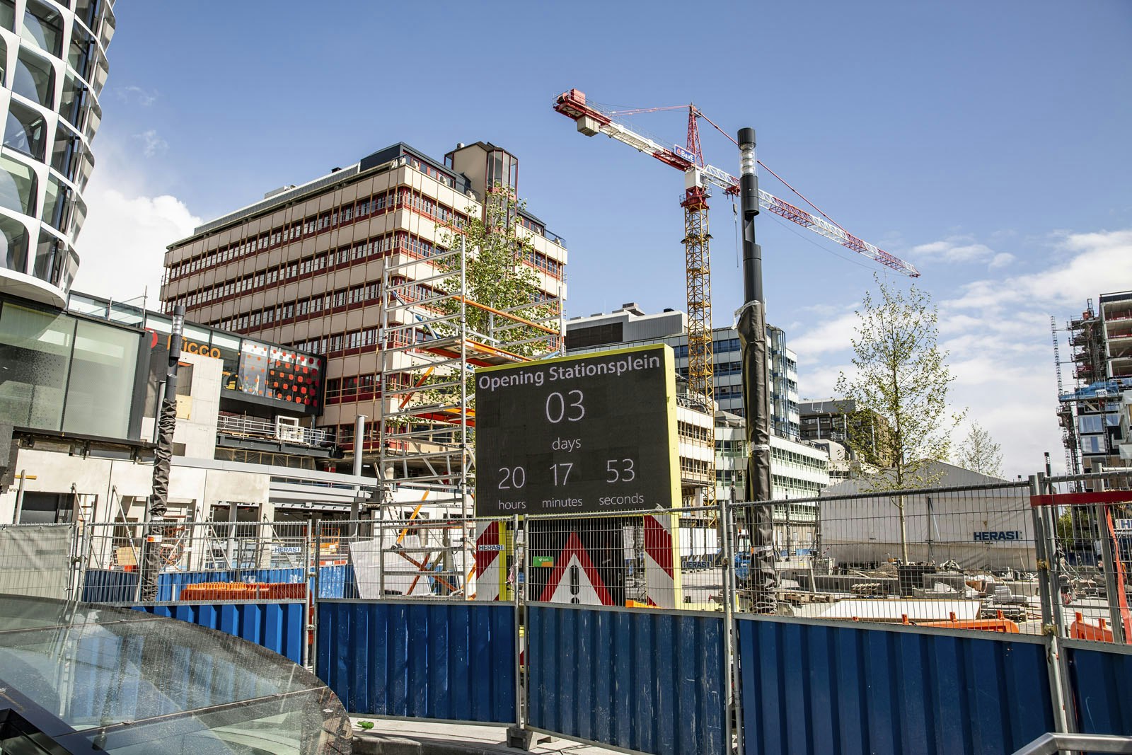 Op het Stationsplein staat sinds donderdag een digitale klok die aftelt tot de opening van het tweede deel van het plein. Zaterdagmiddag duurde het nog ruim 3 dagen tot het nieuwe gedeelte van het Stationsplein opengaat.