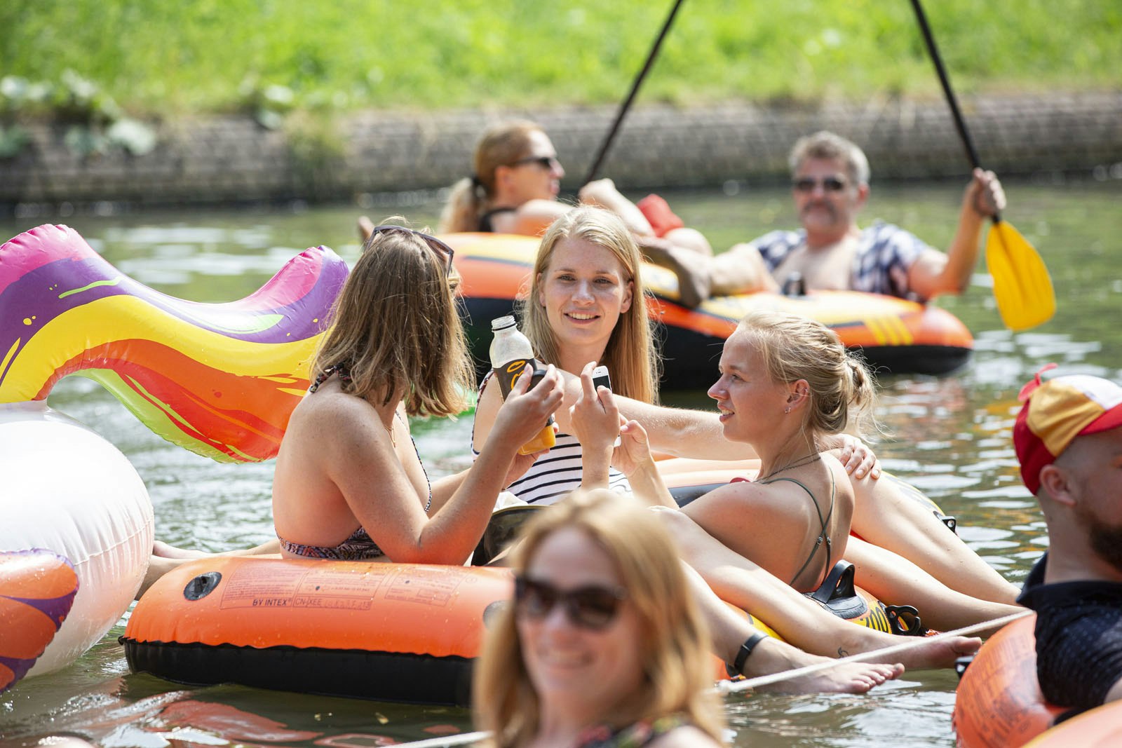 Vorig jaar deden er iets meer dan tien mensen mee aan het evenement. De deelnemers van dit jaar gingen bij Park Lepelenburg het water in. Via de singel dobberden ze naar de Nieuwegracht om uiteindelijk te ‘finishen’ bij de Brigittenbrug.