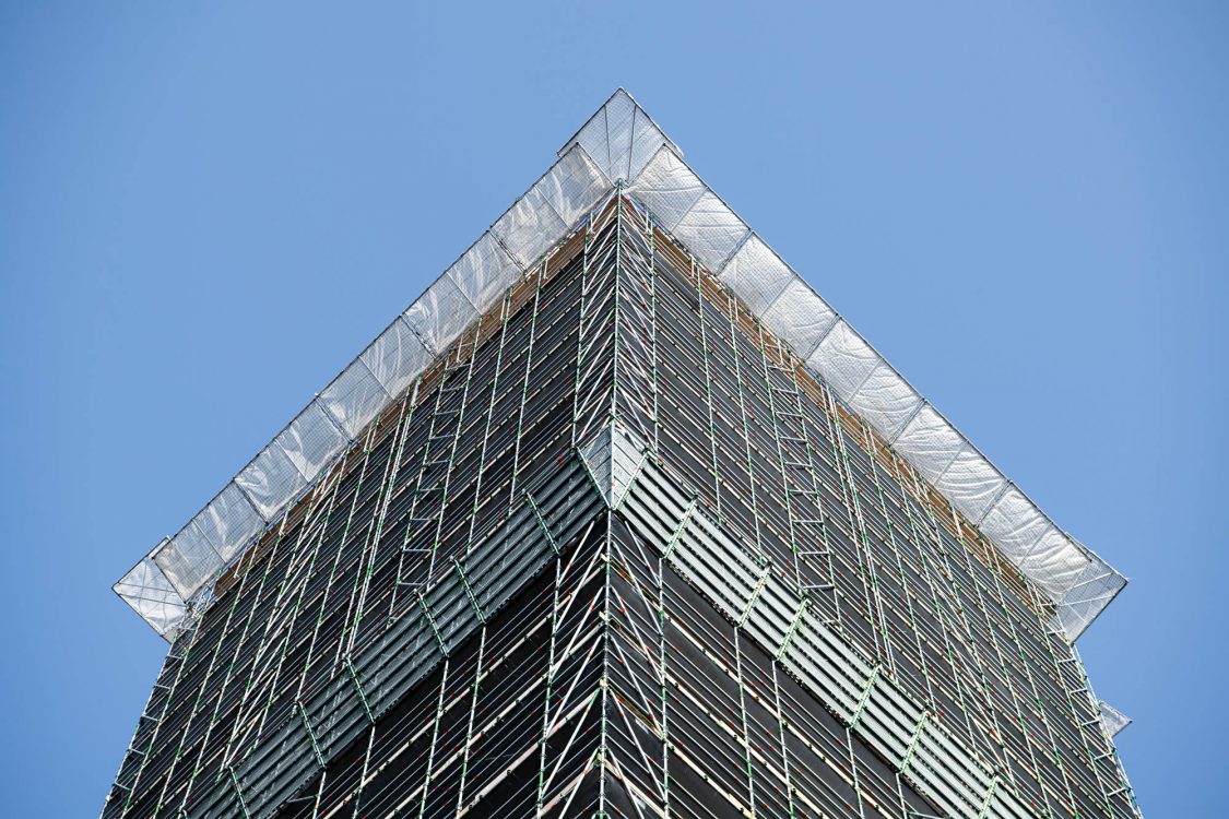 Het hoogste gebouw van Utrecht gaat schuil achter de grootste steiger van de stad. De Domtoren is nu bijna niet meer te zien. De komende jaren is de indrukwekkende steigerconstructie hetgeen wat indruk moet maken.