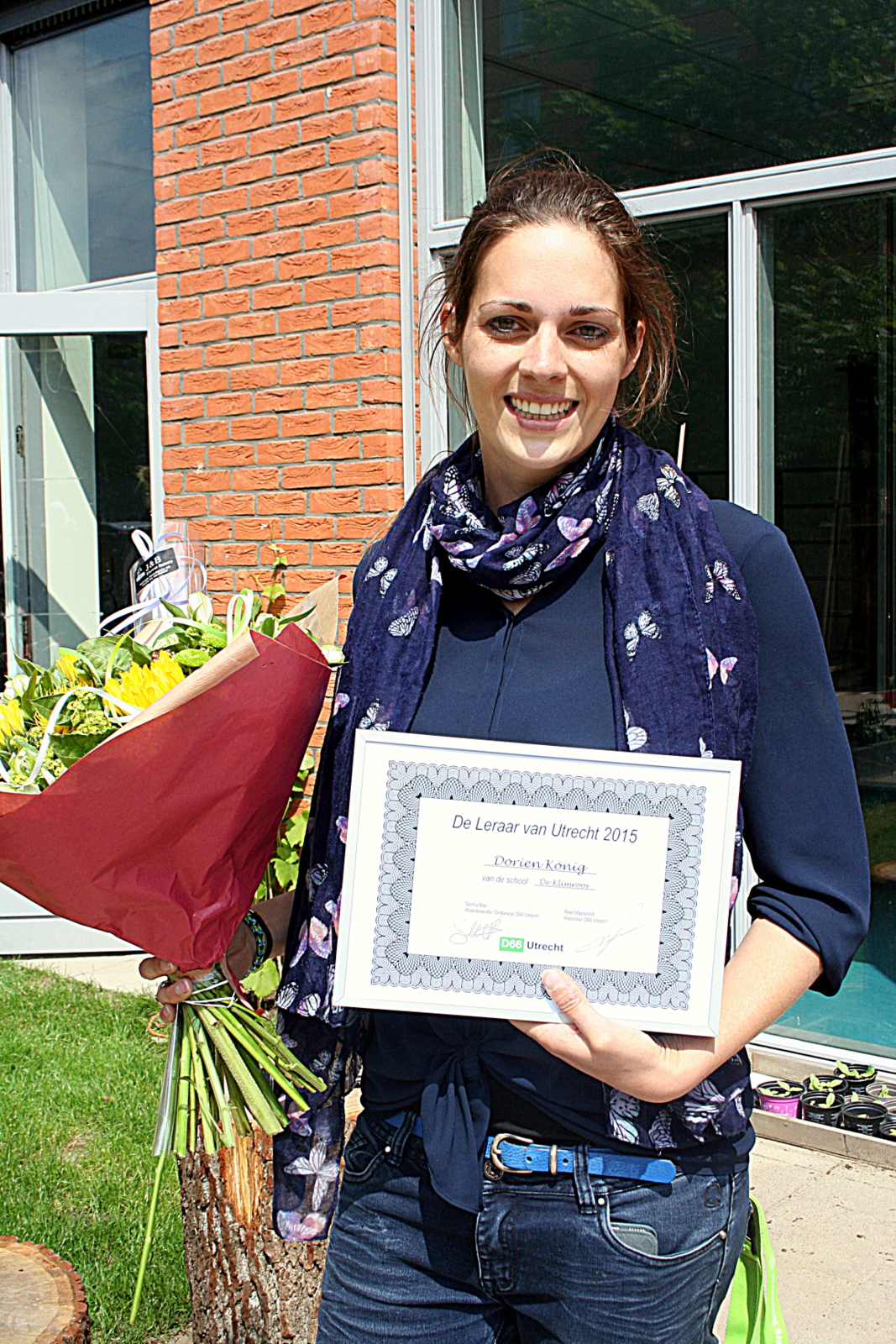 Dorien König van basisschool De Klimroos in Leidsche Rijn is verkozen tot Leraar van Utrecht 2015. Ze kreeg de prijs uitgereikt van Michiel Gakeer, de winnaar van vorig jaar, en Selma Bas, D66-raadslid in Utrecht.
