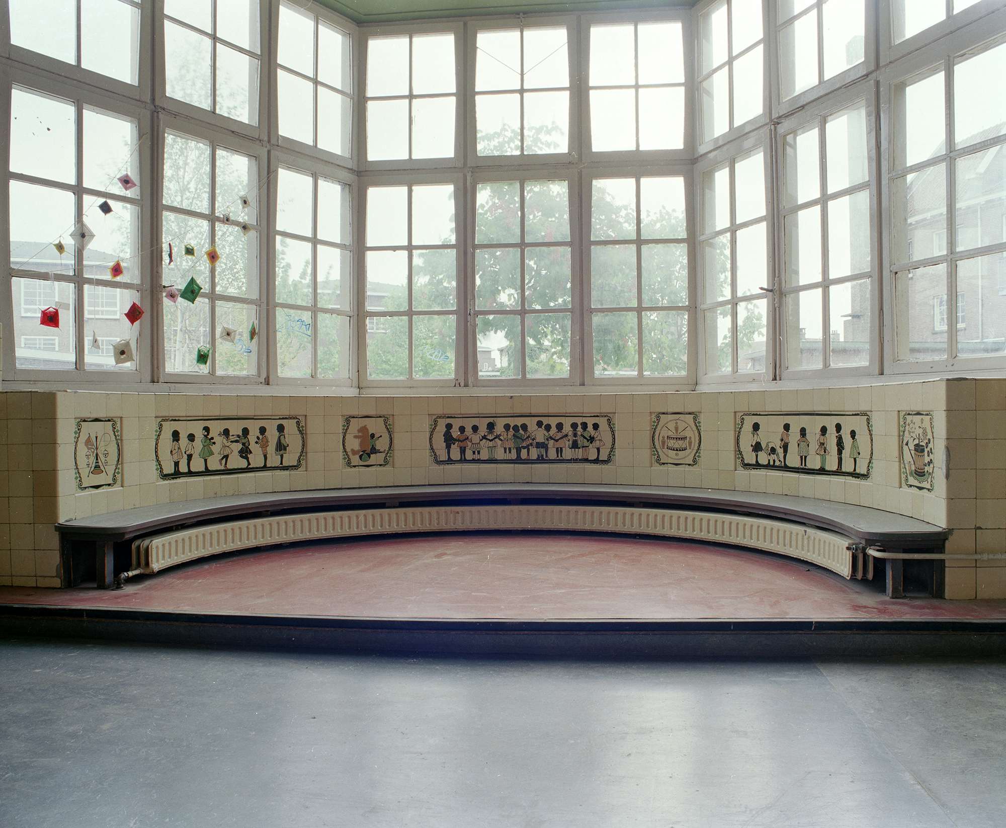 Het karakteristieke gebouw telde naast dienstvertrekken 9 leslokalen, een gymnastiekzaal en een speelplaats. In de gangen hingen veel keramische tegels met silhouet-afbeeldingen.