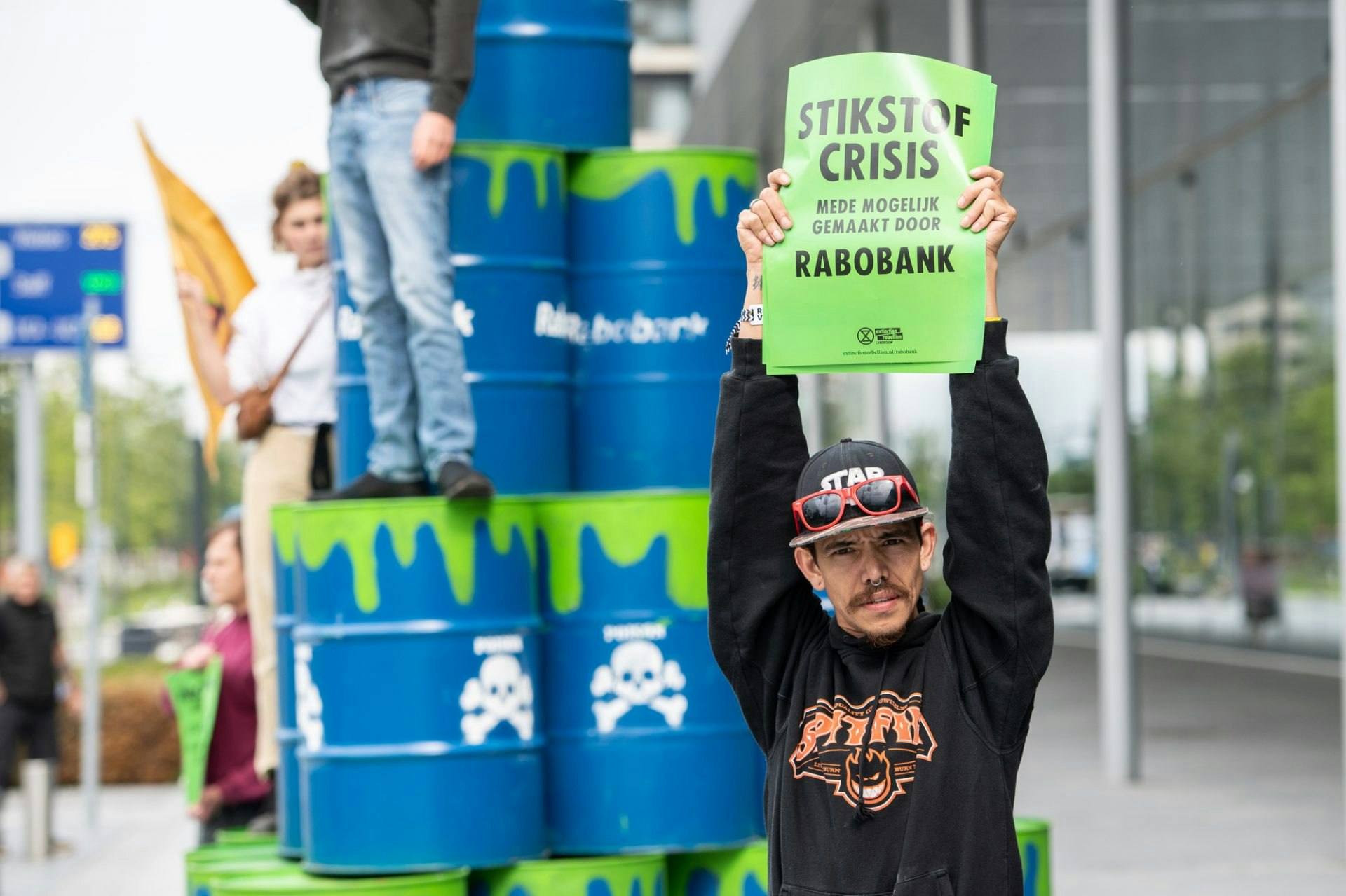 Verschillende actievoerders verzamelden rond 11.30 uur nabij het hoofdkantoor van de bank. Op een afgesproken tijdstip liepen zo’n vijftien demonstranten richting het bankgebouw waar een busje met vaten kwam aanrijden. Er werd snel een pyramide gebouwd met de vaten, waarop het Rabobanklogo of doodskoppen met ‘poison’ staan.