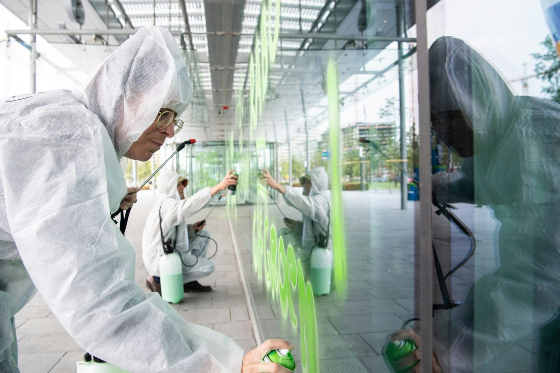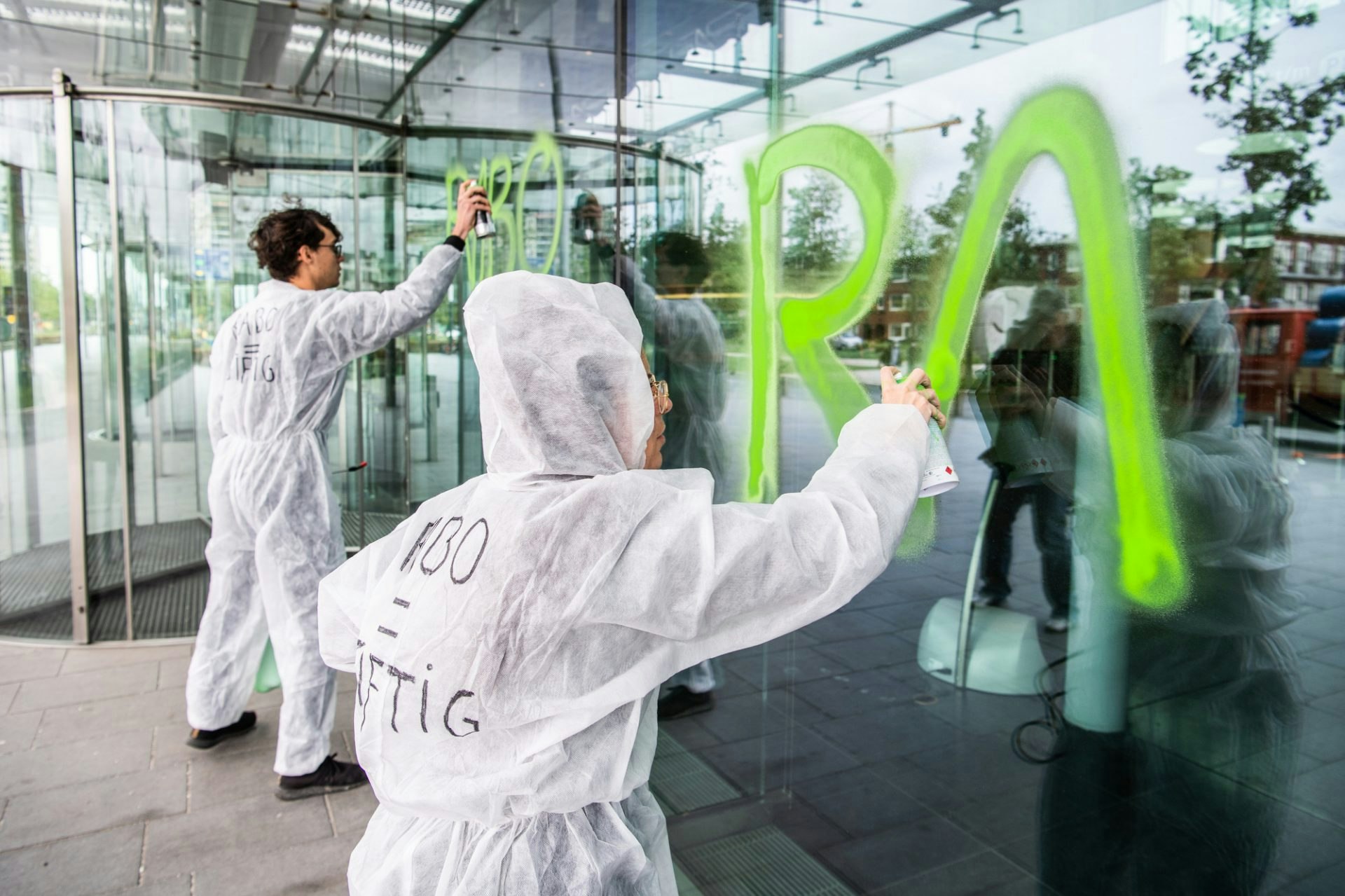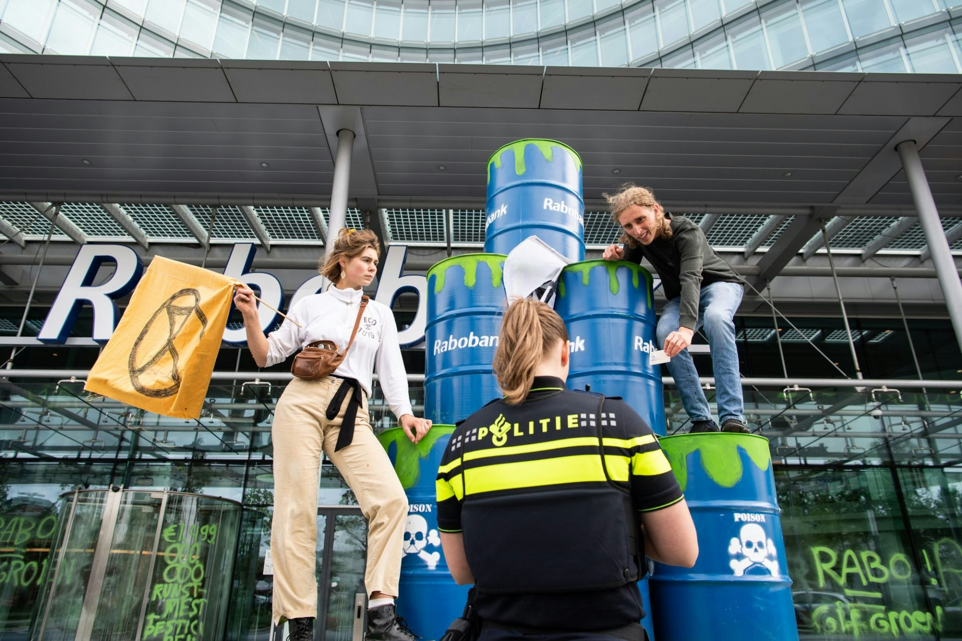 Ondertussen gingen actievoerders in witte pakken teksten als ‘Rabobank = gifgroen’ op de gevel van de Rabobank spuiten. Dit gebeurde volgens Extinction Rebellion met spuitkrijt, wat er makkelijk af te wassen is. Na een kort gesprek tussen een medewerker van de bank en een woordvoerder van de activisten kwam de politie aanrijden. De drie actievoerders die de bank hadden beklad werden gearresteerd. De andere demonstranten vertrokken vervolgens.