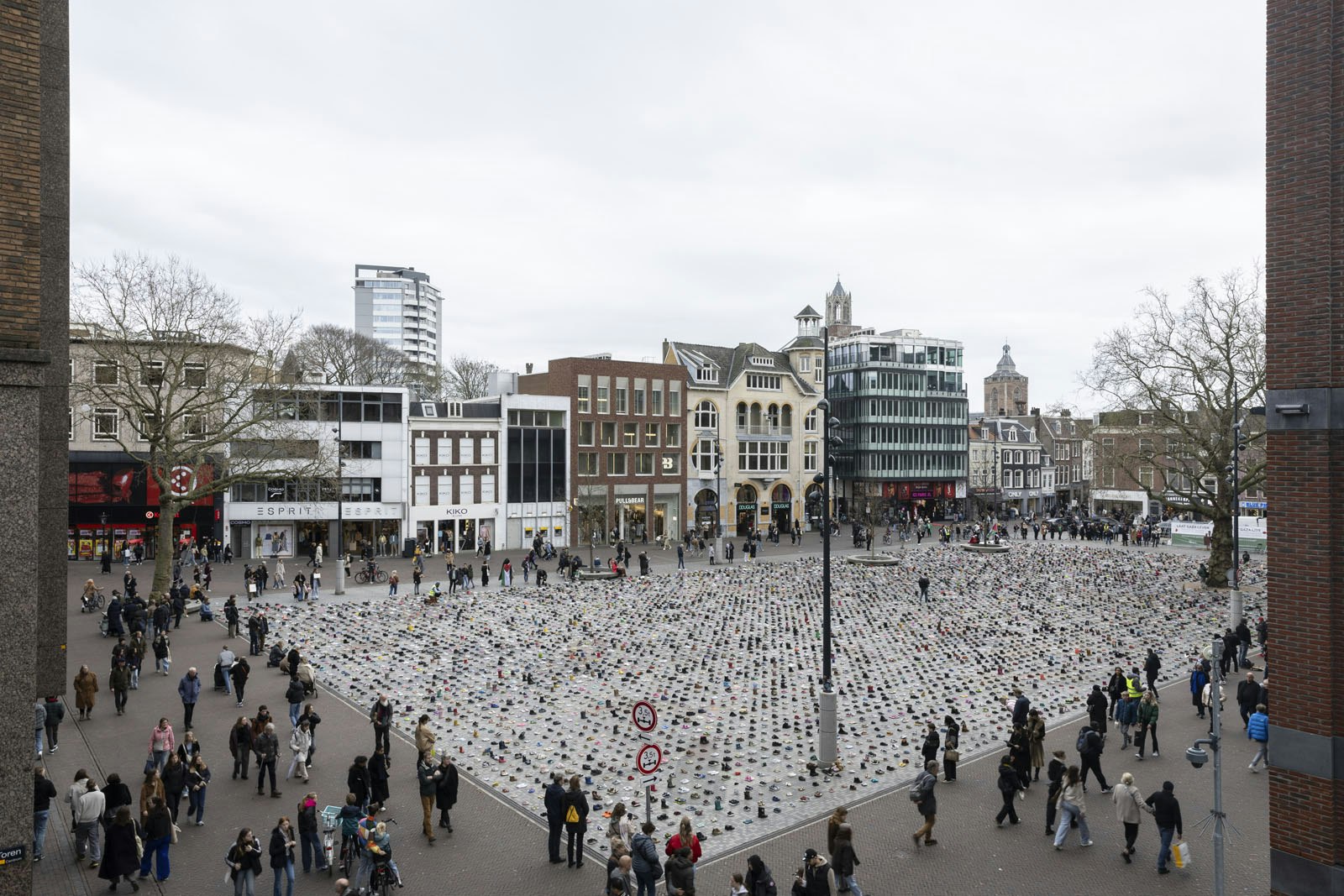 De schoentjes stonden op het mozaïek van het Vredenburgplein, het gedeelte waar op andere dagen de markt te vinden is. In sommige schoentjes was een bloem gestopt en bij anderen stond een knuffeldier. Ook werden via een luidspreker de namen opgenoemd van de kinderen die zijn omgekomen in de oorlog.