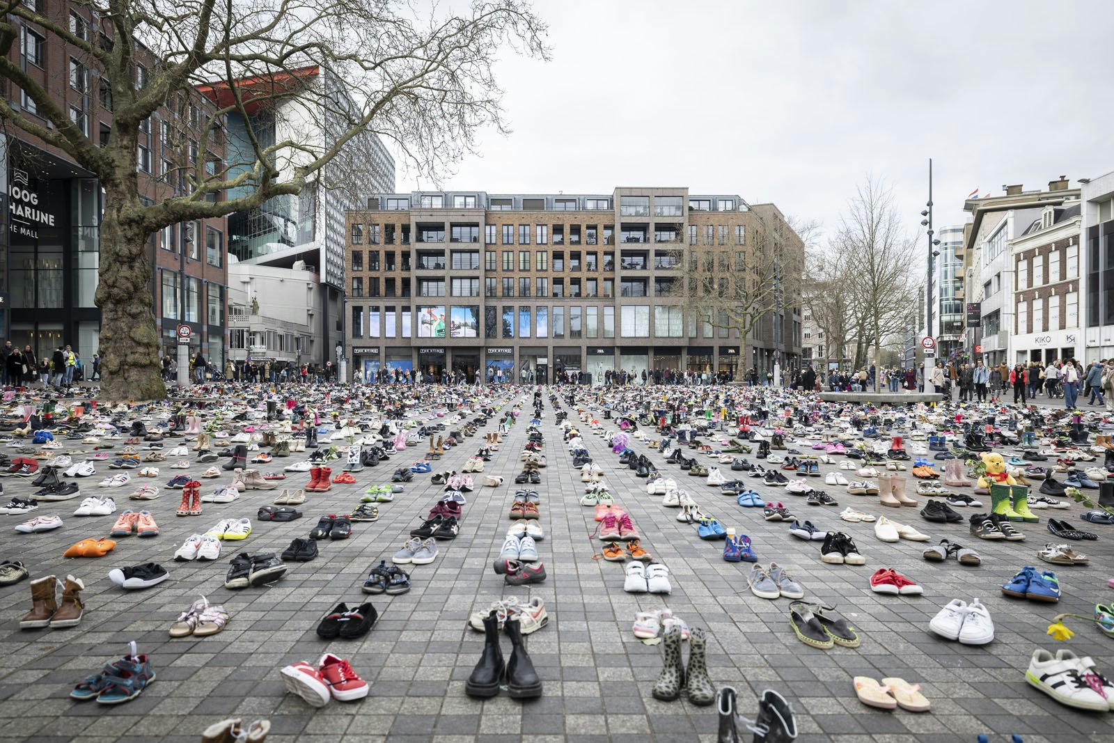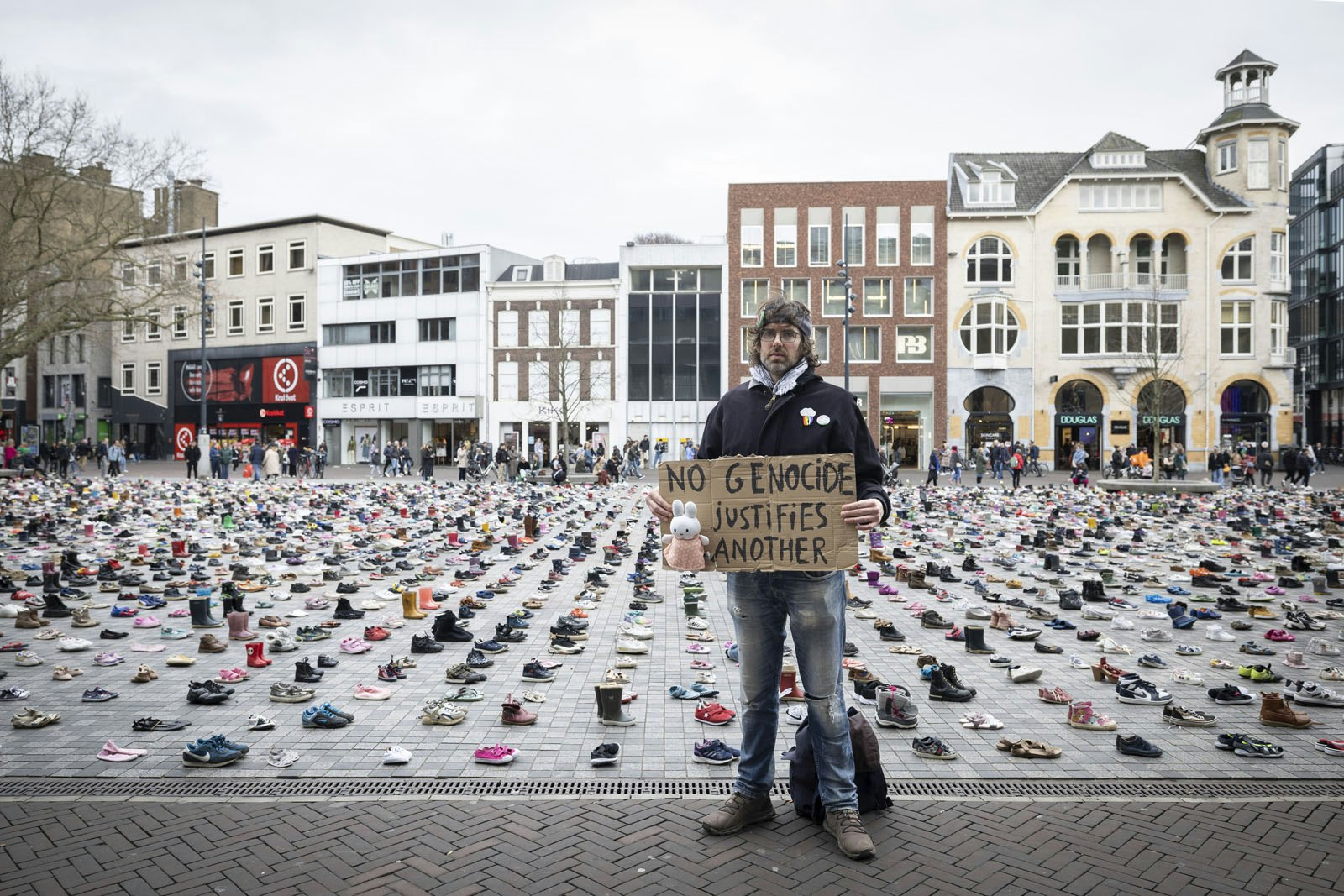 Sportschoentjes, sandaaltjes, laarsjes en allerlei andere kinderschoenen stonden zondag op het Vredenburgplein in Utrecht. Met dit zogenoemde herdenkingsprotest werd stilgestaan bij de duizenden kinderen die sinds 7 oktober vorig jaar zijn omgekomen in Gaza.