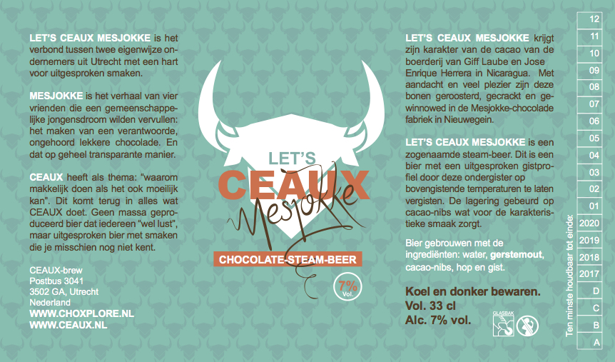 Het eerste Utrechtse chocoladebiertje is een feit. Brouwerij CEAUX heeft samen met The Chocolate Explores een nieuw biertje ontwikkeld: Let’s CEAUX Mesjokke. Zondag 11 oktober wordt dit herfstbier gepresenteerd in Bert’s Bierhuis aan de Twijnstraat.