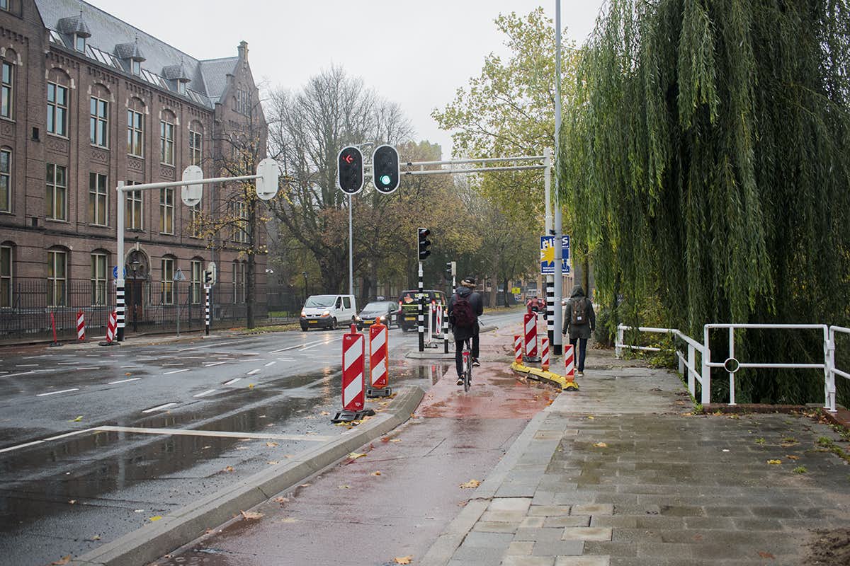 Vanaf vandaag kunnen fietsers hun weg vervolgen op het doorgetrokken fietspad langs de Catharijnesingel ter hoogte van de Bartholomeibrug. Ze hoeven niet meer te wachten voor het verkeerslicht om over te steken naar de linkerkant van de weg.
