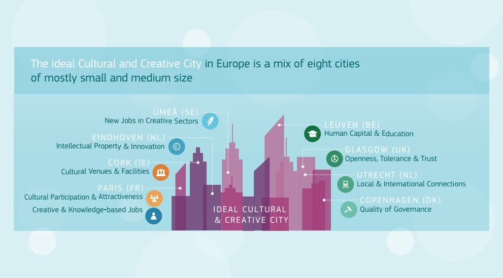 De EU stelde dit jaar voor de eerste keer de Cultural and Creative Cities Monitor op. De ideale culturele en creatieve stad in Europa bestaat volgens de Europese Commissie uit een mix van acht kleine en middelgrote steden: Utrecht, Eindhoven, Cork (Ierland), Parijs (Frankrijk), Umeå (Zweden), Leuven (België), Glasgow (Schotland) en Kopenhagen (Denemarken).