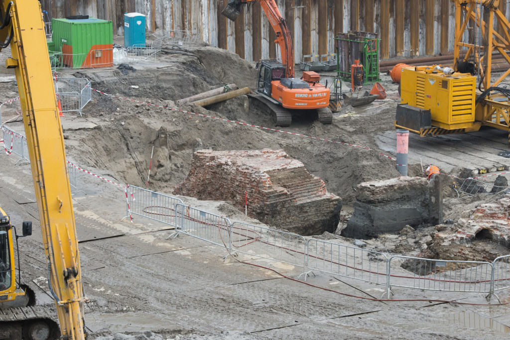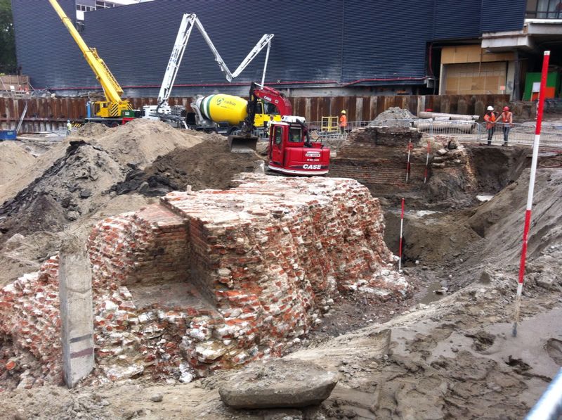 Bij het schoonmaken van de opgegraven muur kwamen gaten aan het licht waar draad uit stak. De bouwvakkers vertrouwden dit niet en schakelden de Explosieven Opruimingsdienst Defensie in. Deze gaat vandaag het materiaal verwijderen en weet niet hoelang het gaat duren. Tijdens het opruimen van de explosieven is al het andere werk op het bouwterrein stilgelegd.