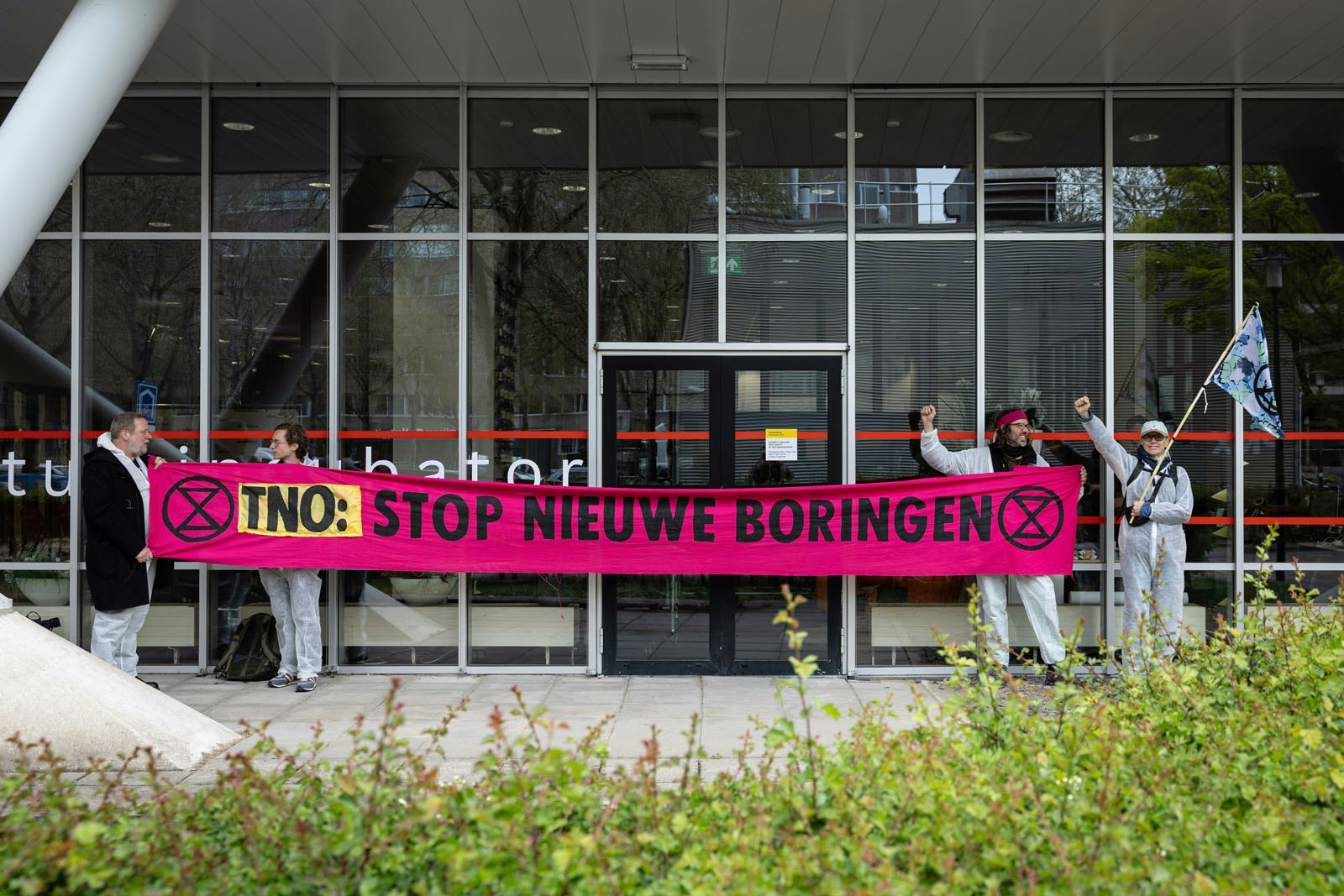 Activisten van Extinction Rebellion blokkeren sinds maandagochtend alle ingangen van het gebouw van TNO op het Utrecht Science Park. De actie is een protest tegen plannen om opnieuw naar gas te boren in het Waddengebied.