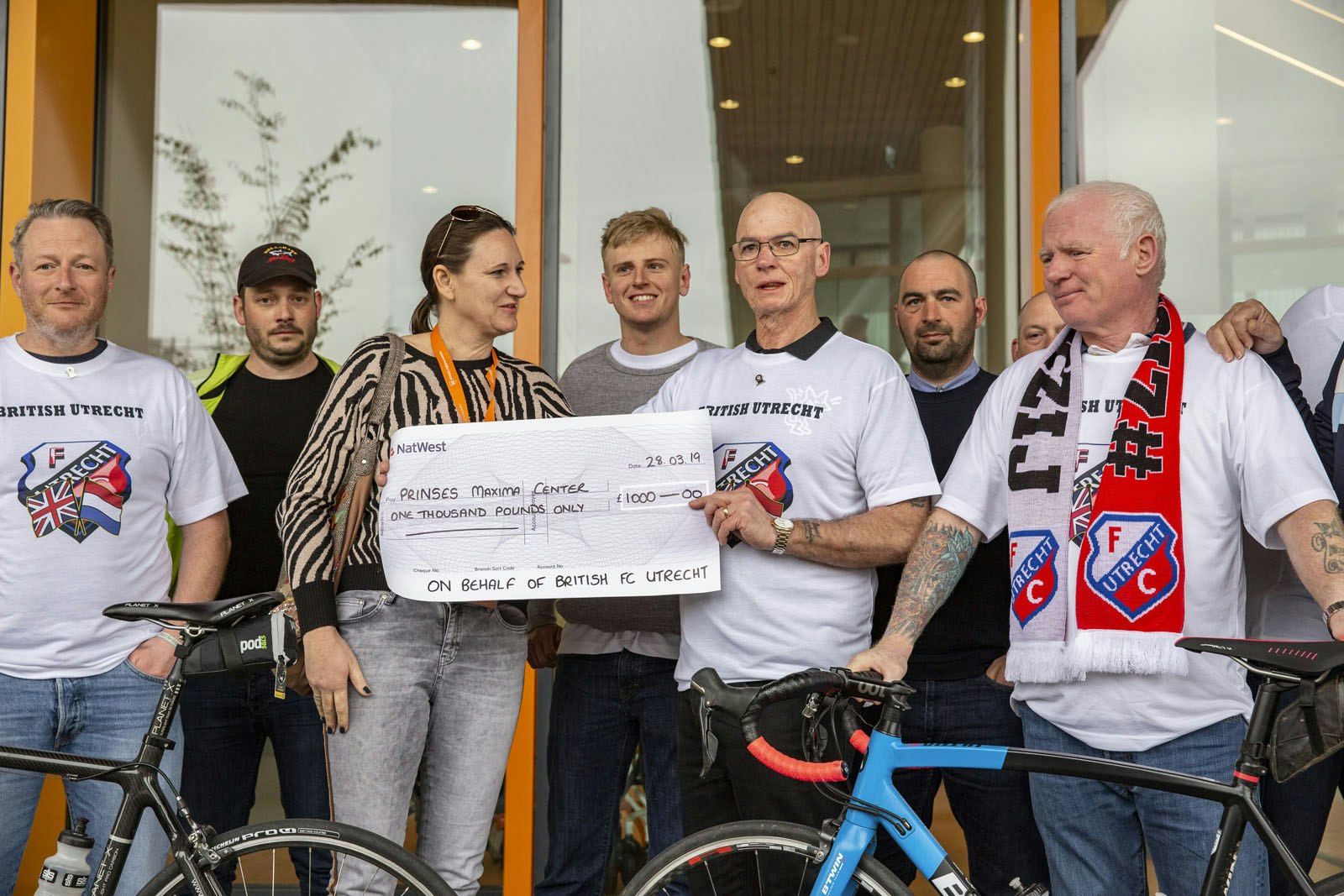 De groep Britse voetbalsupporters die met de fiets vanaf het Engelse Doncaster naar Utrecht reisden zijn zondagochtend gearriveerd. Het eindpunt van de tocht was het Prinses Máxima Centrum waar een cheque werd overhandigd.