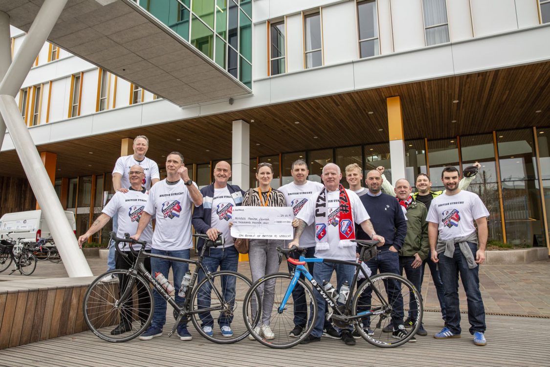 De groep Britse voetbalsupporters die met de fiets vanaf het Engelse Doncaster naar Utrecht reisden zijn zondagochtend gearriveerd. Het eindpunt van de tocht was het Prinses Máxima Centrum waar een cheque werd overhandigd.