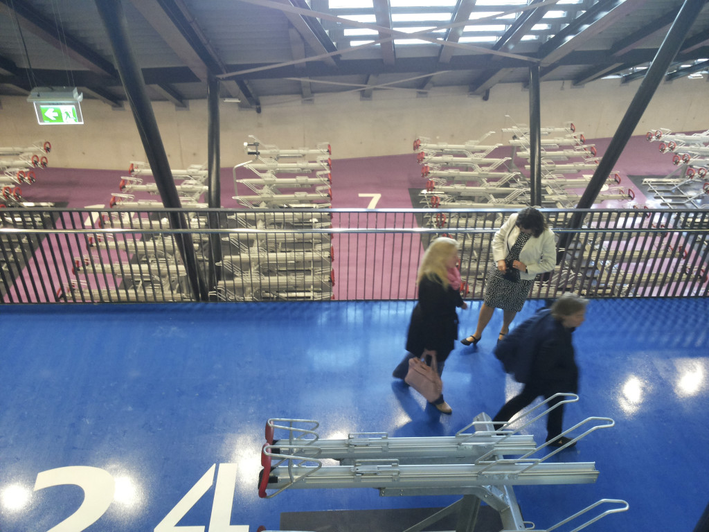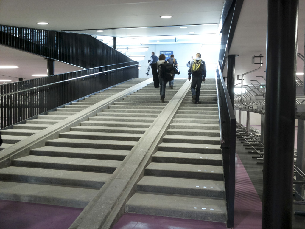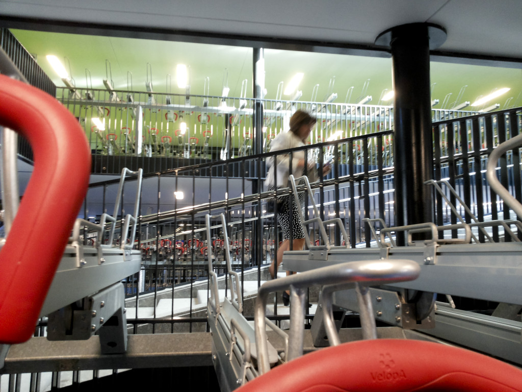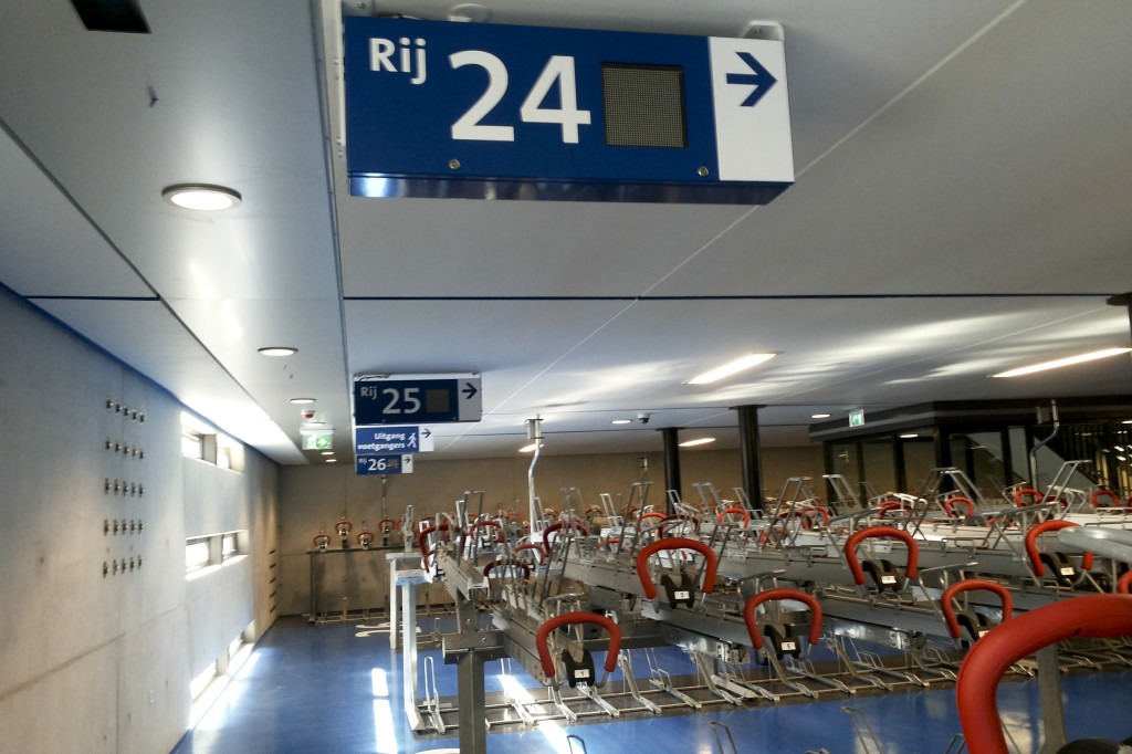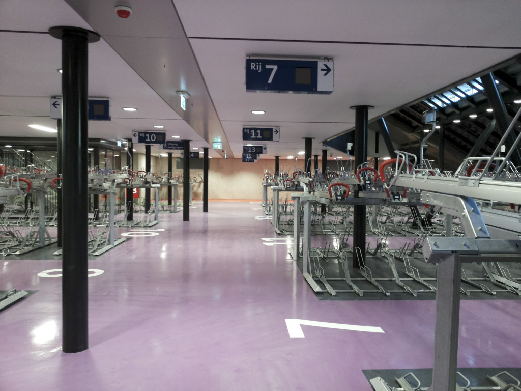 De fietsenstalling heeft drie verdiepingen. Een fiets is toch makkelijk terug te vinden, want de gangen worden aangeduid met en cijfer en iedere verdieping heeft een andere kleur. Bang om de trein te missen als er alleen nog maar ruimte is op de bovenste verdieping? Daar is wat op bedacht: het station is voor reizigers zonder fiets direct te bereiken vanaf deze tweede verdieping.