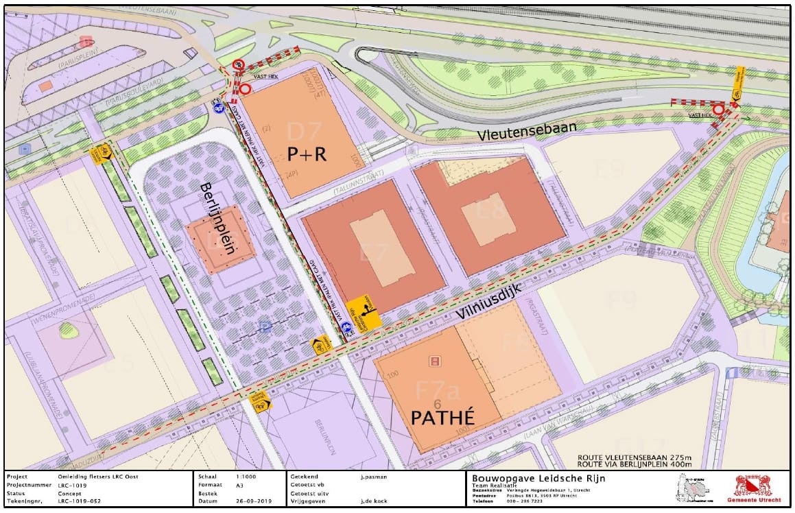 Een deel van het fietspad langs de Vleutensebaan in Leidsche Rijn wordt vanaf 20 januari 2020 voor ongeveer een half jaar afgesloten. Reden van de afsluiting is de bouw van de parkeergarage bij het Berlijnplein.