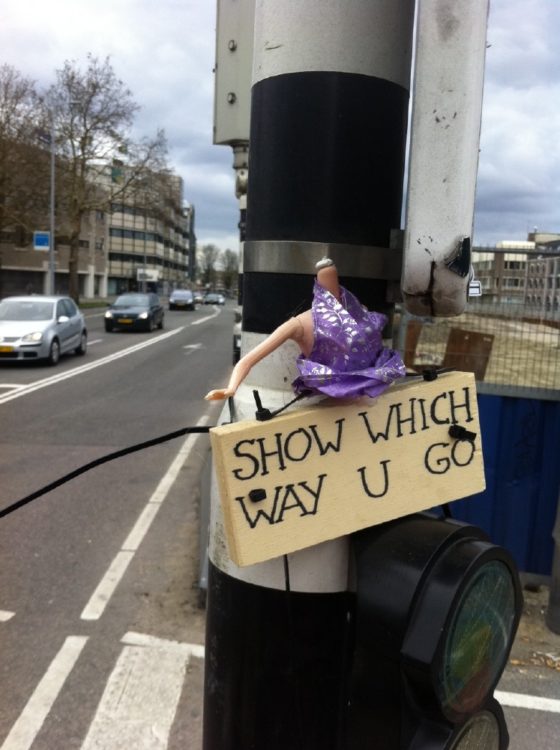 haha gaaf ze hier ook terug te zien! Ik heb 10 barbies opgehangen op zondag 25 maart. Helaas zijn er na de donderdag avond erop al een hoop onthoofd of kapot getrokken, dus heb de meeste alweer verwijderd. Leuk dat ze hier op staan! 😀