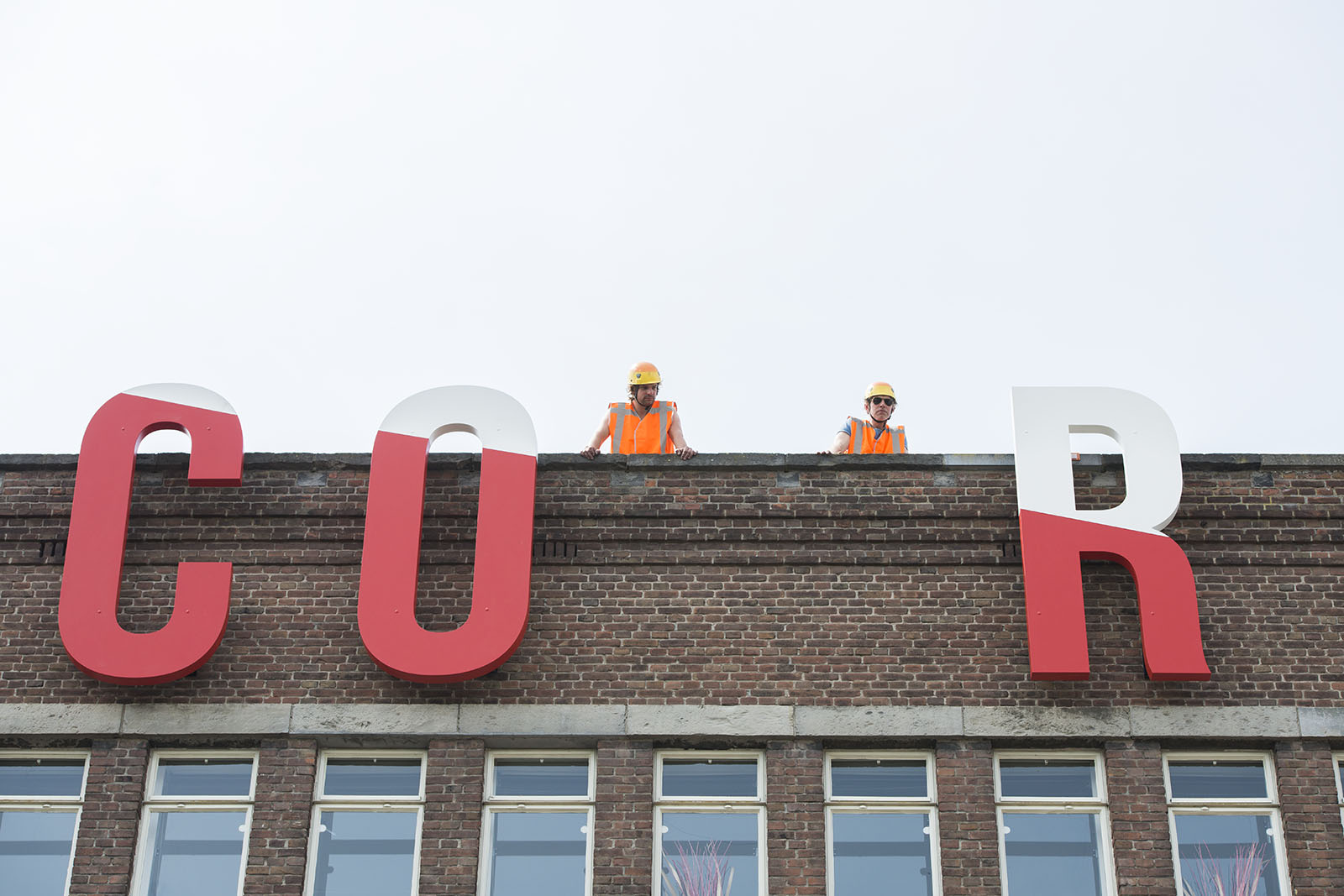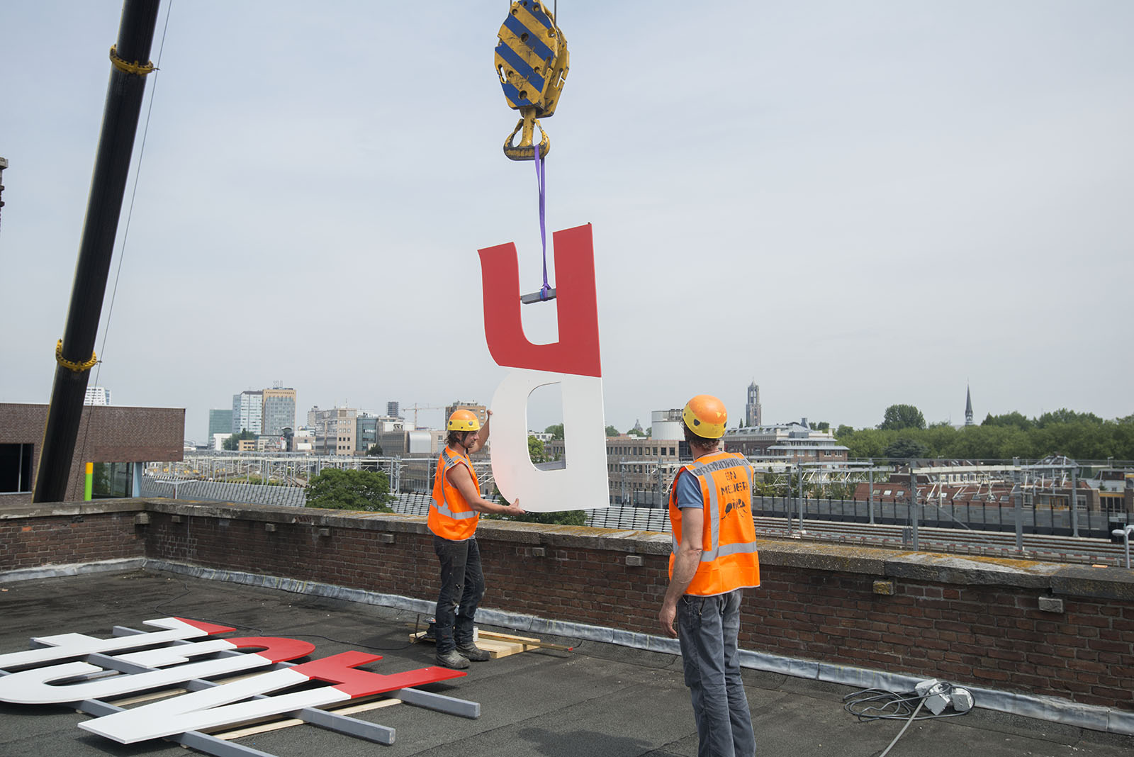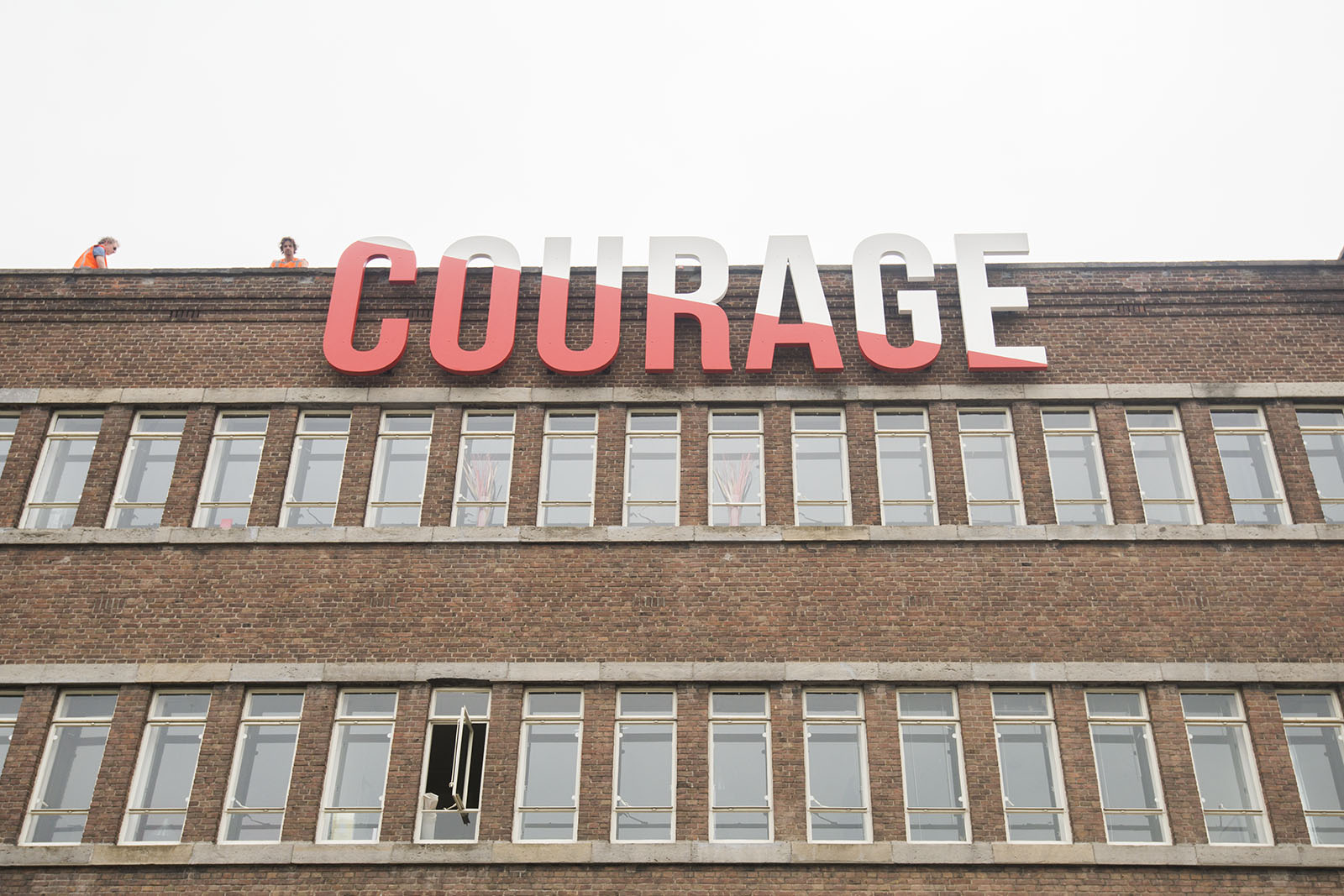 Gisteren was het zover, de letters werden met een kraan naar boven gehesen en daar gemonteerd. Het 7m bij 2,5m grote ontwerp is in de kleuren van het wapen van Utrecht: rood en wit. “Tourrenners krijgen vanaf het dak van Rudolf Magnus ‘Courage’ mee. Helikopters van de Tour zullen het kunstwerk zeker spotten, omdat ‘Courage’ ook van bovenaf leesbaar is. Daarnaast zal iedere langs fietsende, rijdende, rennende of wandelende Utrechter ‘Courage’ meekrijgen. Deze universele aanmoediging is dus niet alleen voor de tourrenners, maar voor alle Utrechters en andere voorbijgangers”, liet Van den Ham eerder weten.