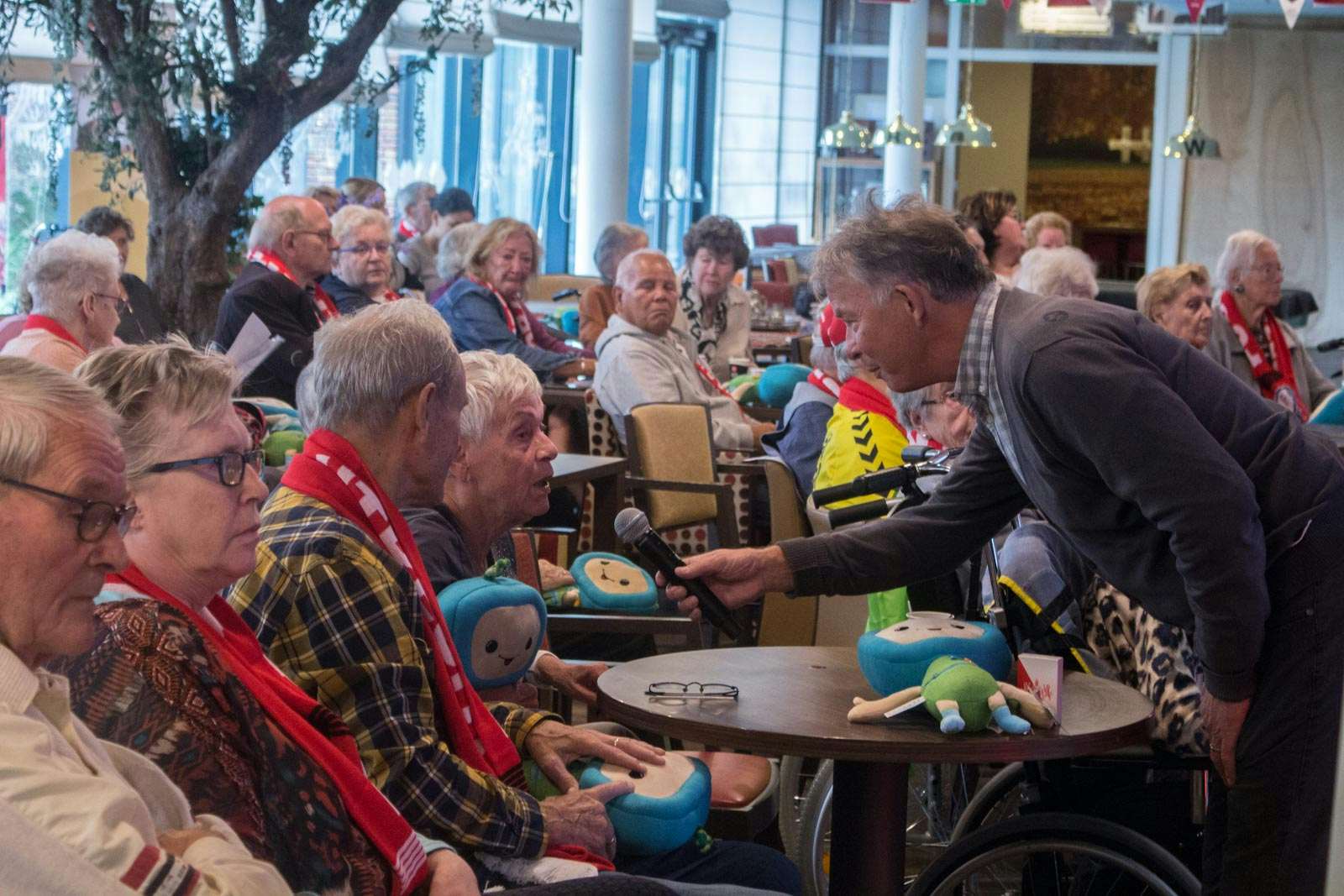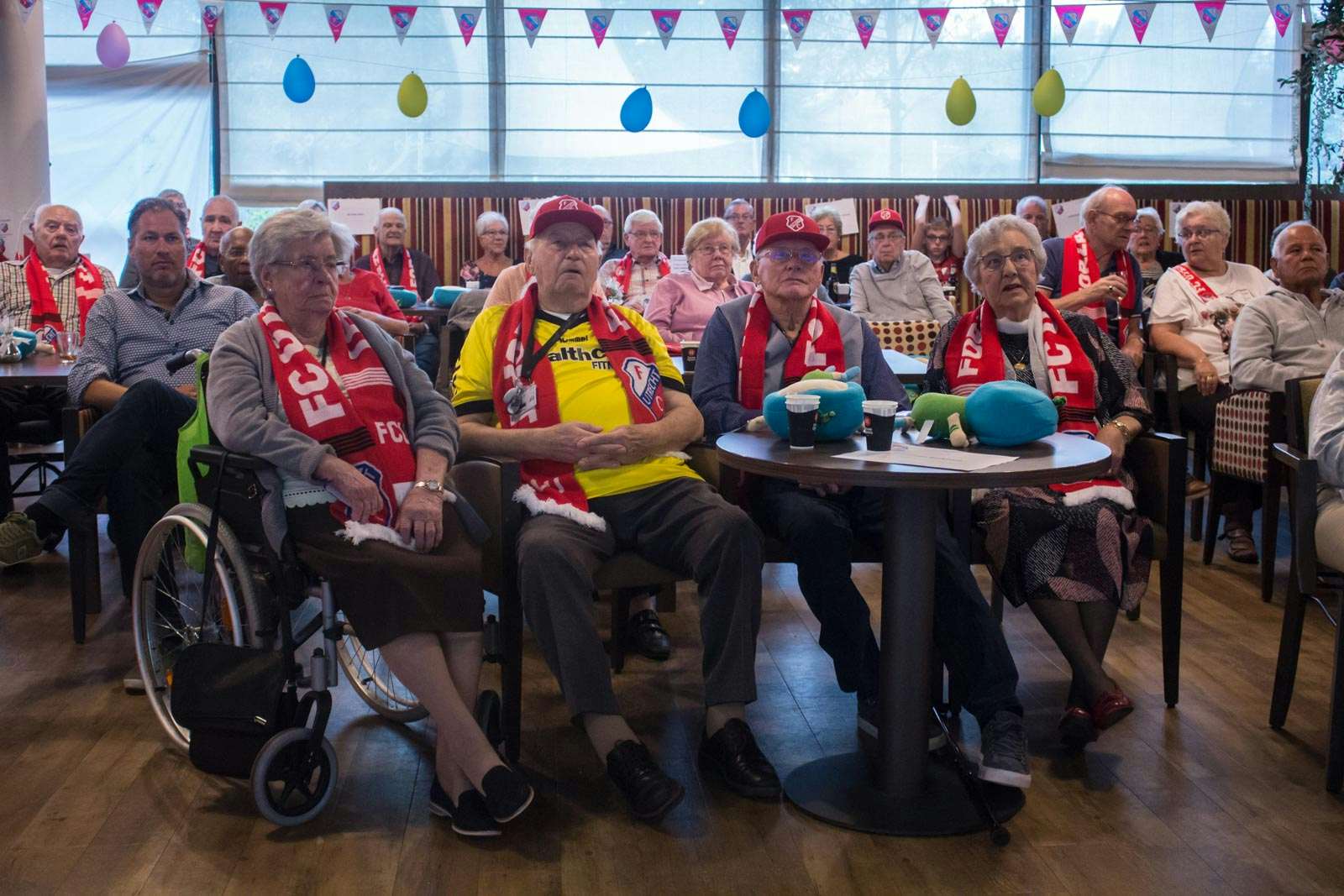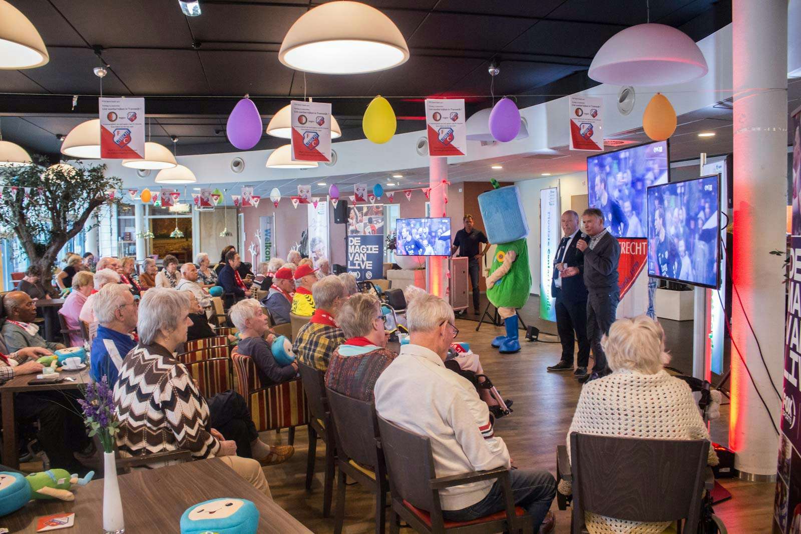 De bewoners van Woonzorgcentrum Transwijk wisten zelf nog van niets toen ze zondagochtend op werden gehaald uit hun kamers en naar de grote ontvangsthal van het zorgcomplex werden gebracht. De verrassing was bij hen dan ook enorm toen bleek dat die ontvangsthal was omgetoverd tot een waar voetbalstadion met grote schermen. Er was zelfs een cameraploeg van FOX Sports aanwezig. Alle ouderen ontvingen een FC Utrecht sjaal en konden onder het genot van een hapje en drankje gezamenlijk naar de wedstrijd tussen Feyenoord en FC Utrecht kijken.